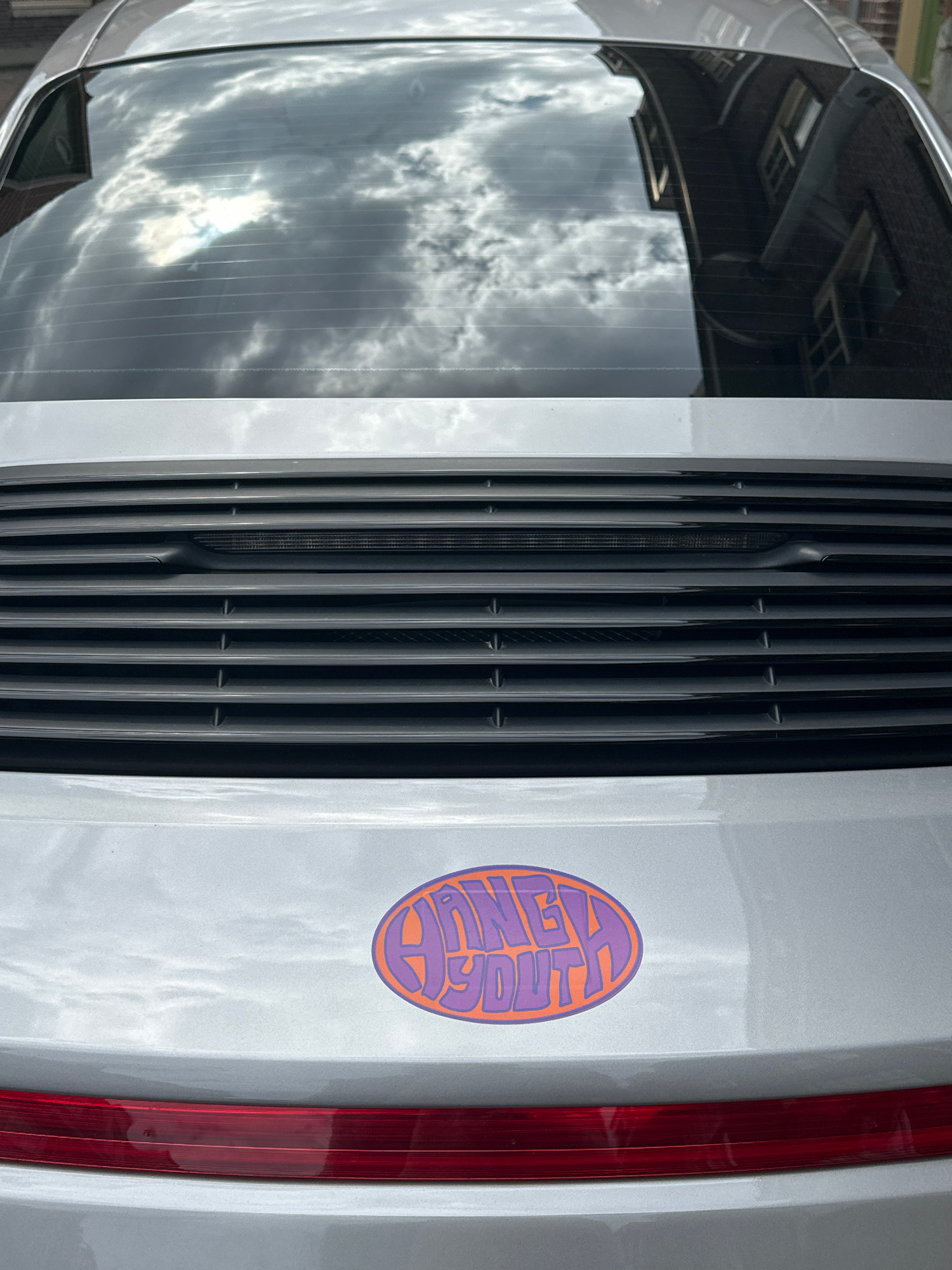 The image shows the rear of a silver car, likely a Porsche, with a distinctive slatted engine cover. Reflected in the rear window are clouds and the rooftop of a building. On the right side of the carβ¦read more