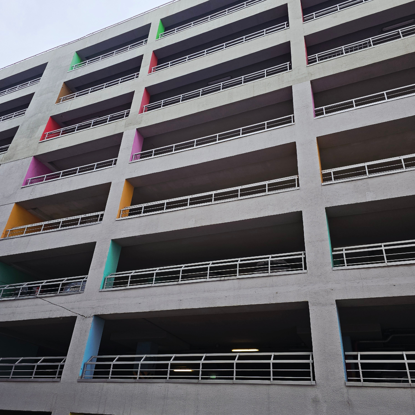 The image captures a low-angle view of the open-air stairwell balconies of the House of the Commune building in Moscow, Russia. The building features a brutalist architectural style with recessed balc…read more
