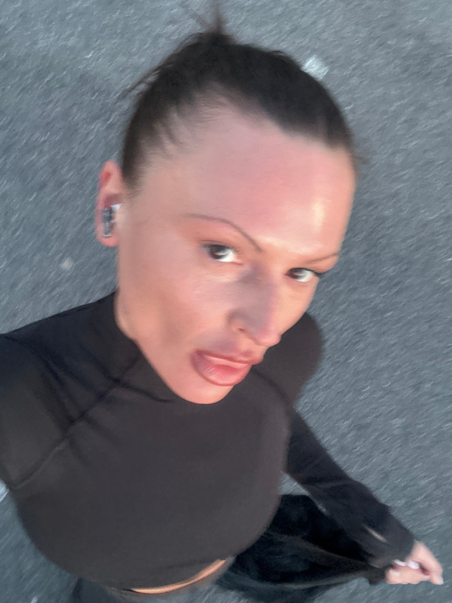 A high-angle photograph captures an individual, identified as female, outdoors in Tunbridge Wells, United Kingdom. The subject has dark hair pulled back, fair skin with prominent highlights, defined e…read more