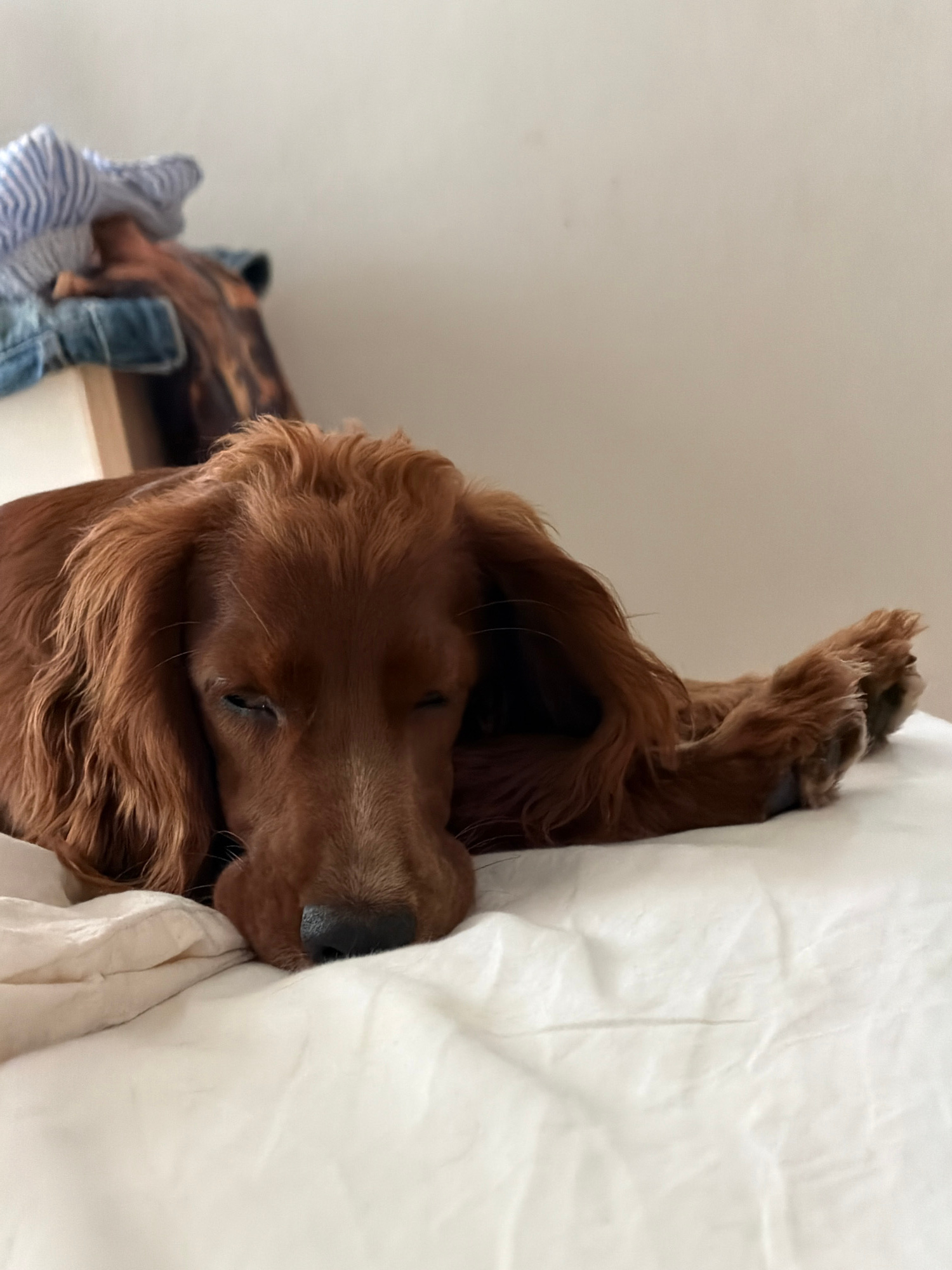 A brown Cocker Spaniel is lying on a white bed sheet. The dog's head is partially buried in the sheet, with its nose visible. The dog is indoors. Clothes or blankets are stacked on a wooden shelf in t…read more