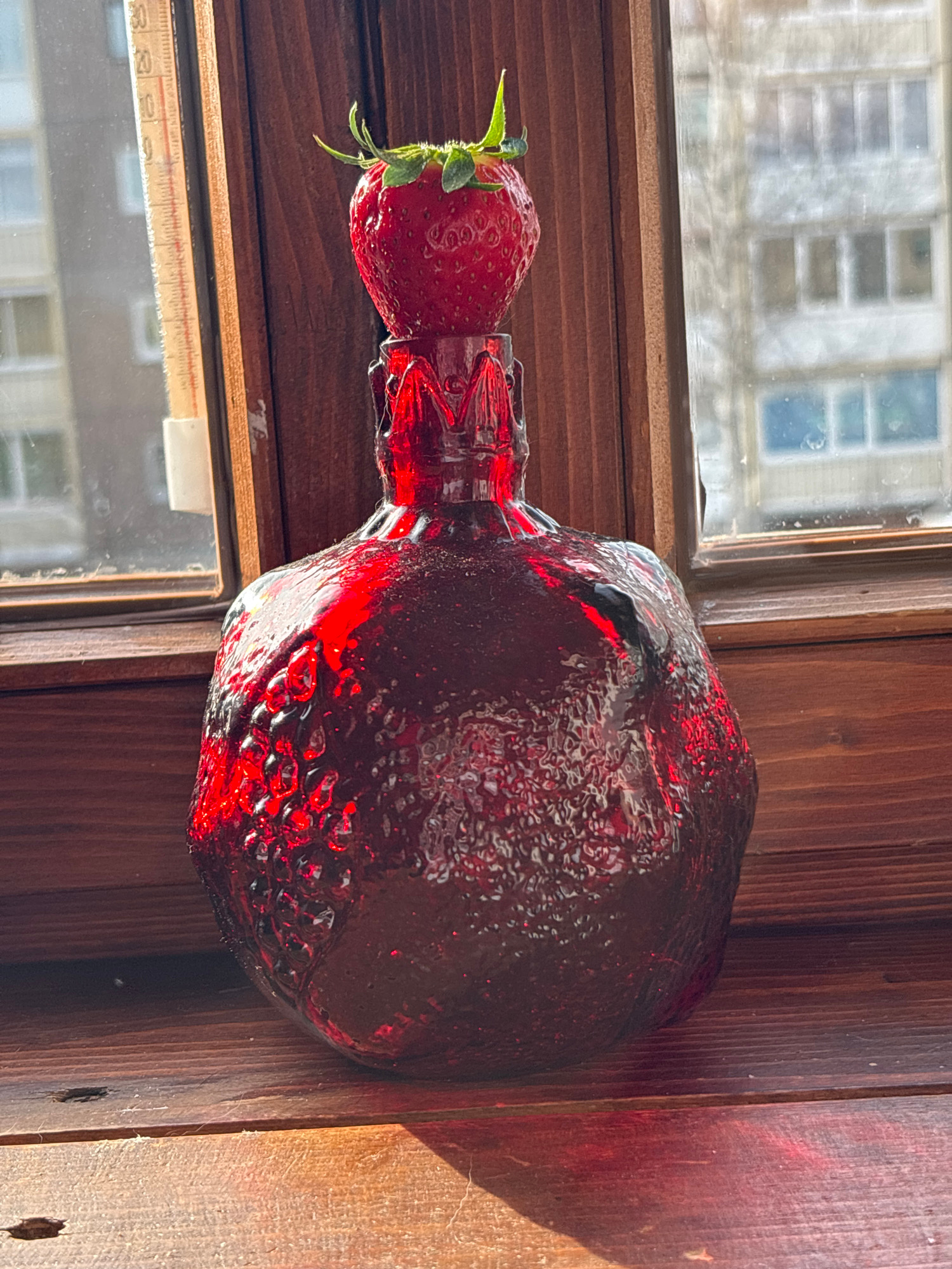 A red glass bottle is positioned horizontally on a wooden windowsill. The bottle has a bulbous shape and a narrow neck. A strawberry is attached to the bottle's neck. Outside the window, a multi-story…read more