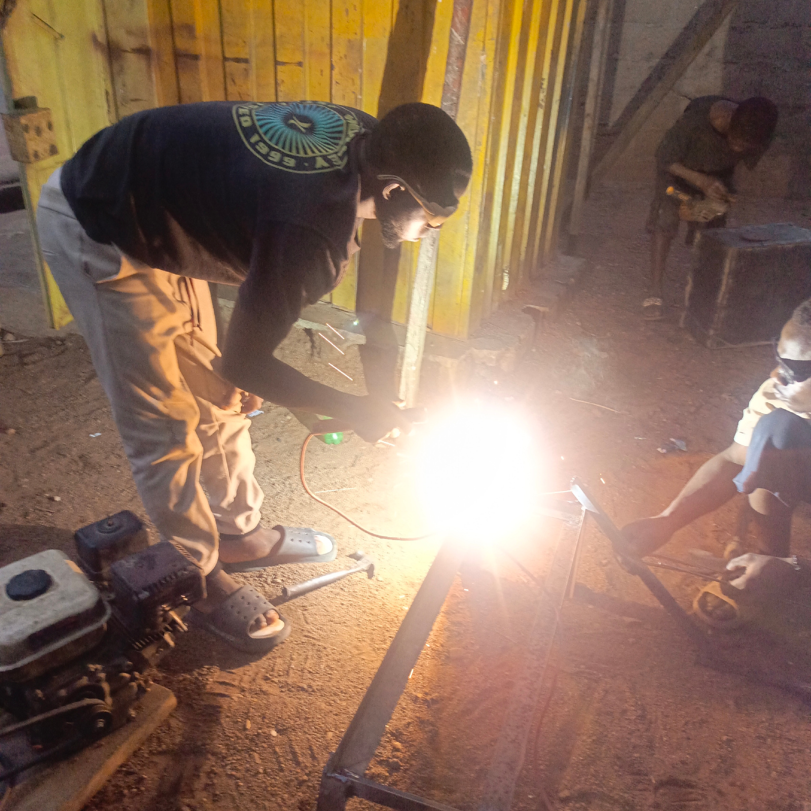 Akwanga, Nigeria. A person wearing a black t-shirt with a circular design, light-colored pants, and sandals welds metal in an outdoor workspace with a dirt floor. Another person, wearing dark clothing…read more