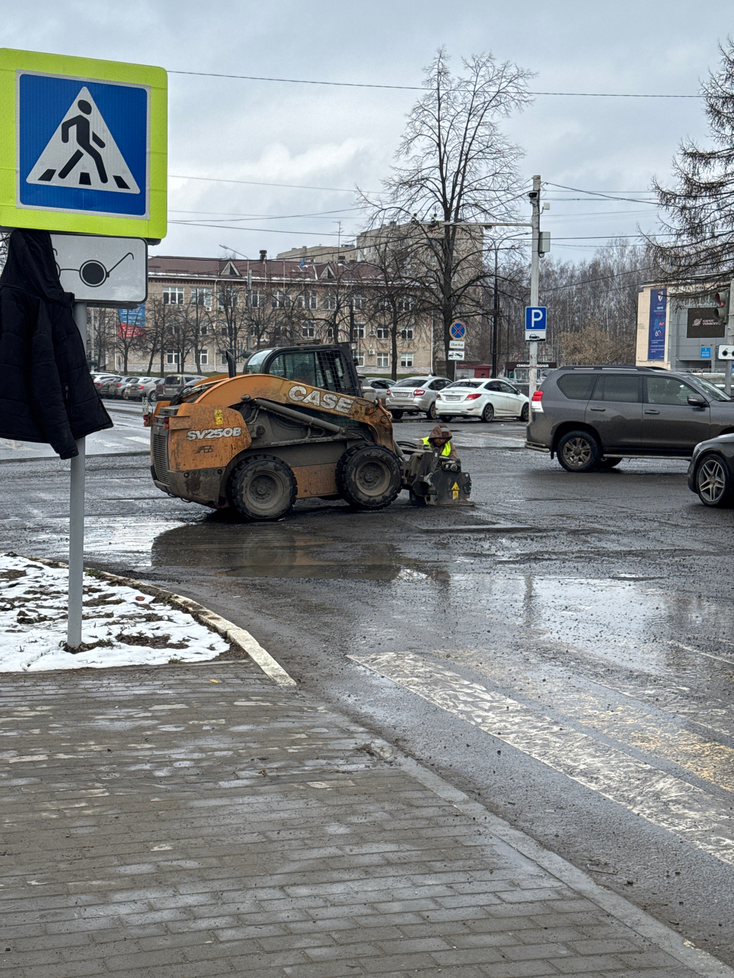 The image shows a street scene in what appears to be the city of Chaikovsky, Russia. On the left, there's a blue and yellow pedestrian crossing sign and a smaller sign with a symbol suggesting a heari…read more