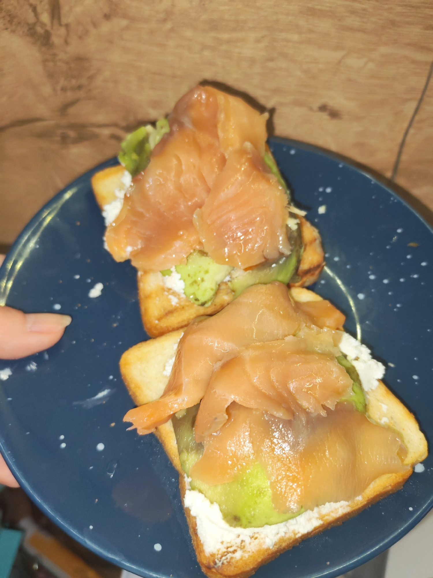 The image presents a close-up view of two open-faced sandwiches, or toasts, resting on a dark blue plate with scattered white speckles. A human hand, with manicured fingernails, is visible on the leftβ¦read more