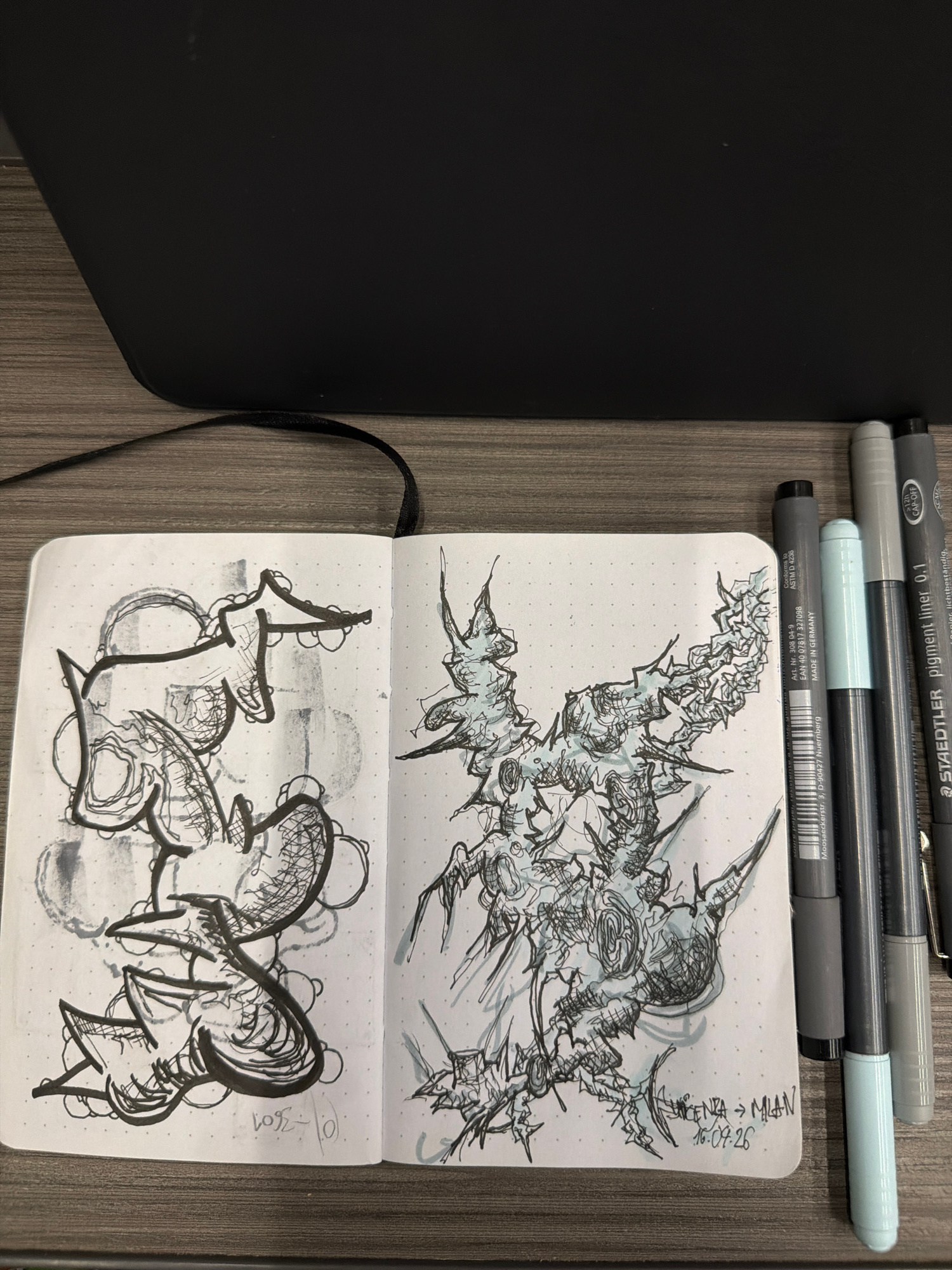 The media file displays an overhead shot of an open notebook lying on a wooden surface, accompanied by several pens and a dark object. The scene suggests a creative workspace. On the left, a matte bl…read more