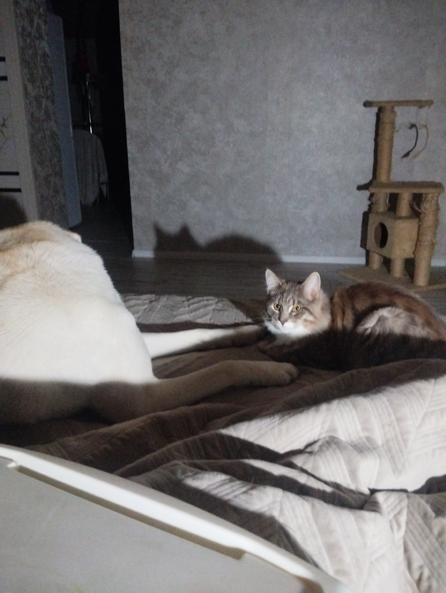 A dog and a cat are lying on a bed in an indoor setting. The dog is a light color and is positioned to the left, with only its back and tail visible. The cat is brown and white, lying beside the dog'sā¦read more