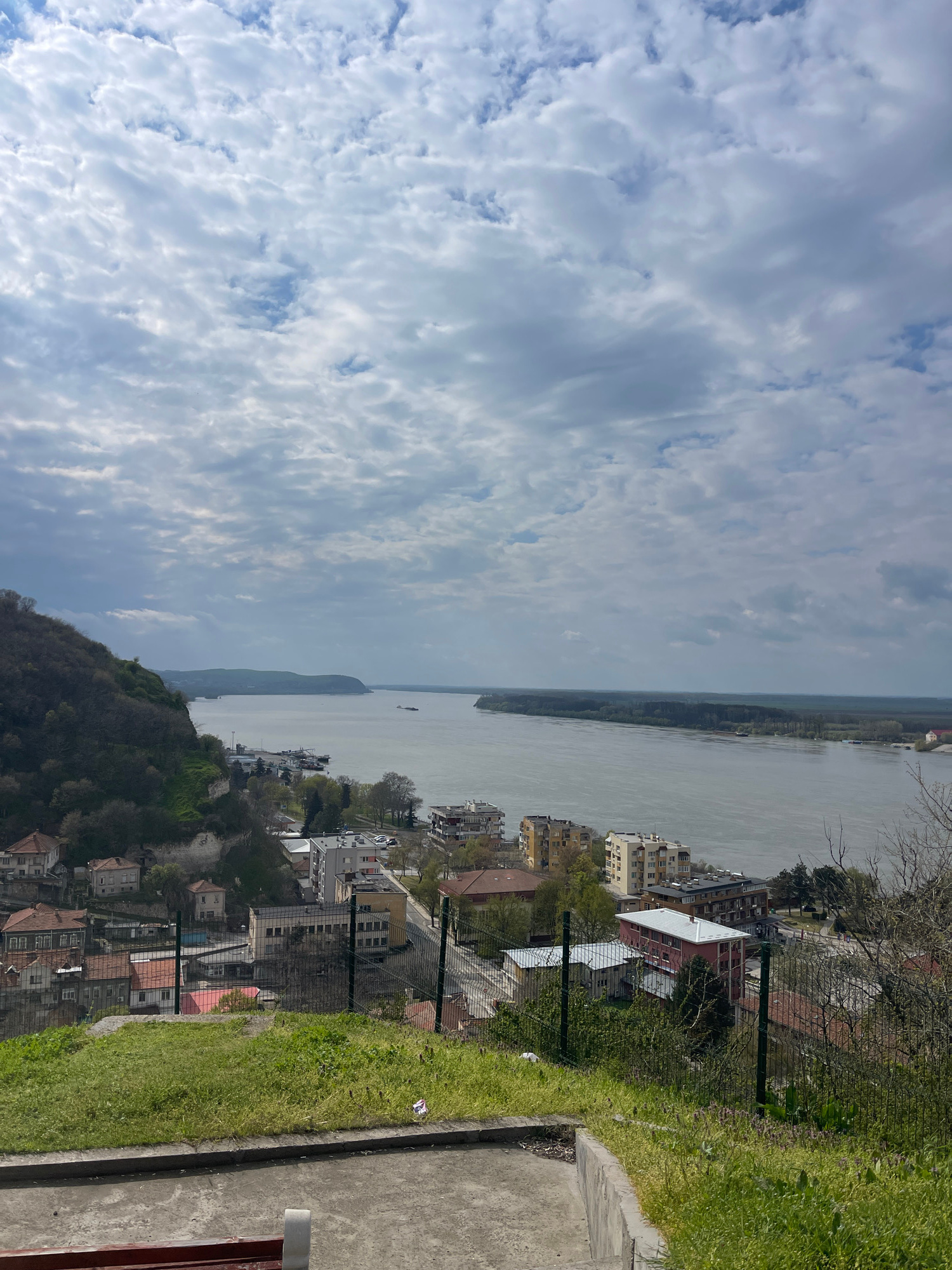 A landscape view from an elevated position overlooking the city of Nikopol, Bulgaria. The sky occupies the left side of the frame and is filled with altocumulus clouds in varying shades of white and g…read more
