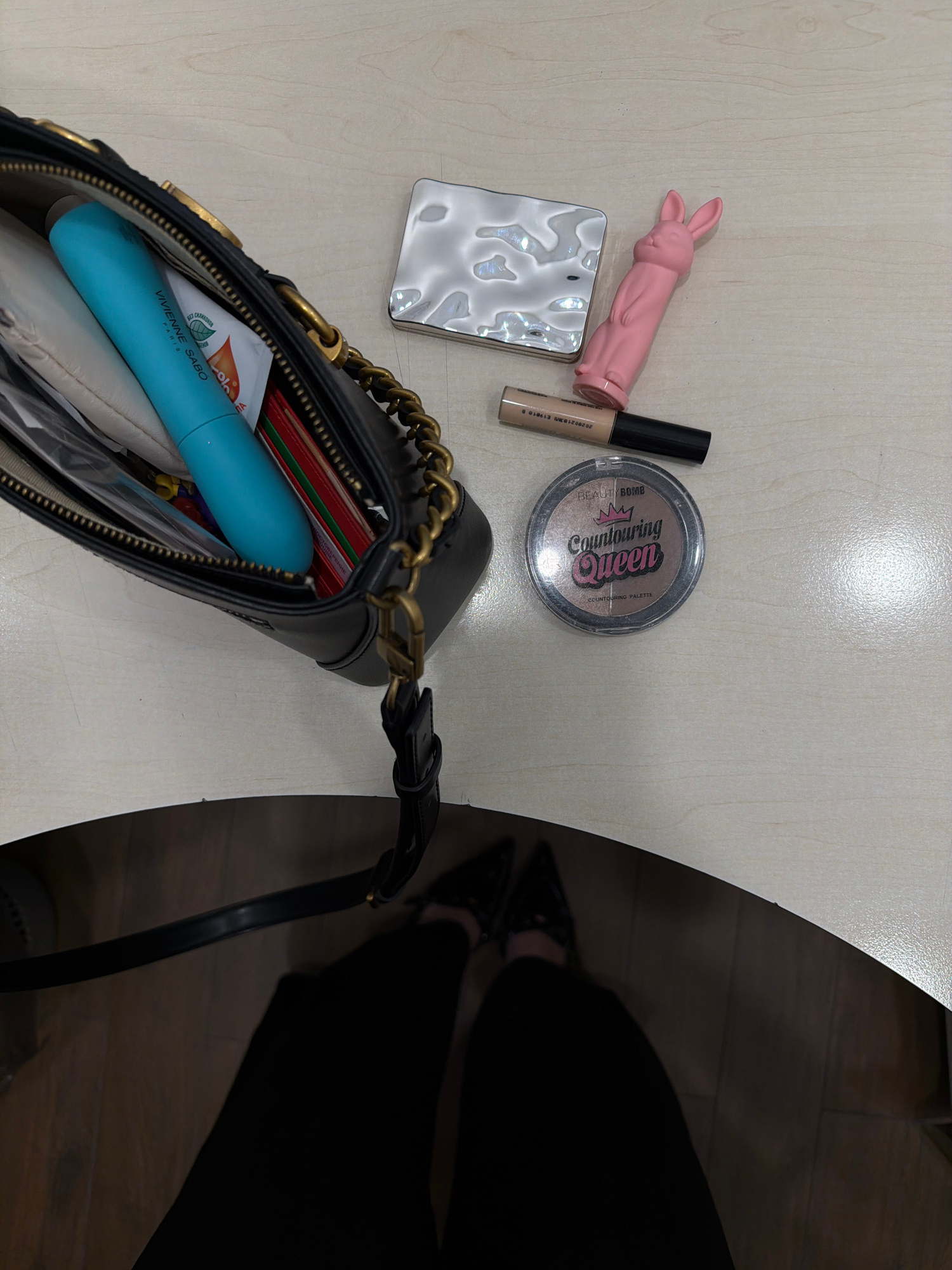 The image shows a light-colored surface with a black purse and various items scattered around it. These items include a pink bunny-shaped object, a silver compact, a concealer, and a contouring palettβ¦read more