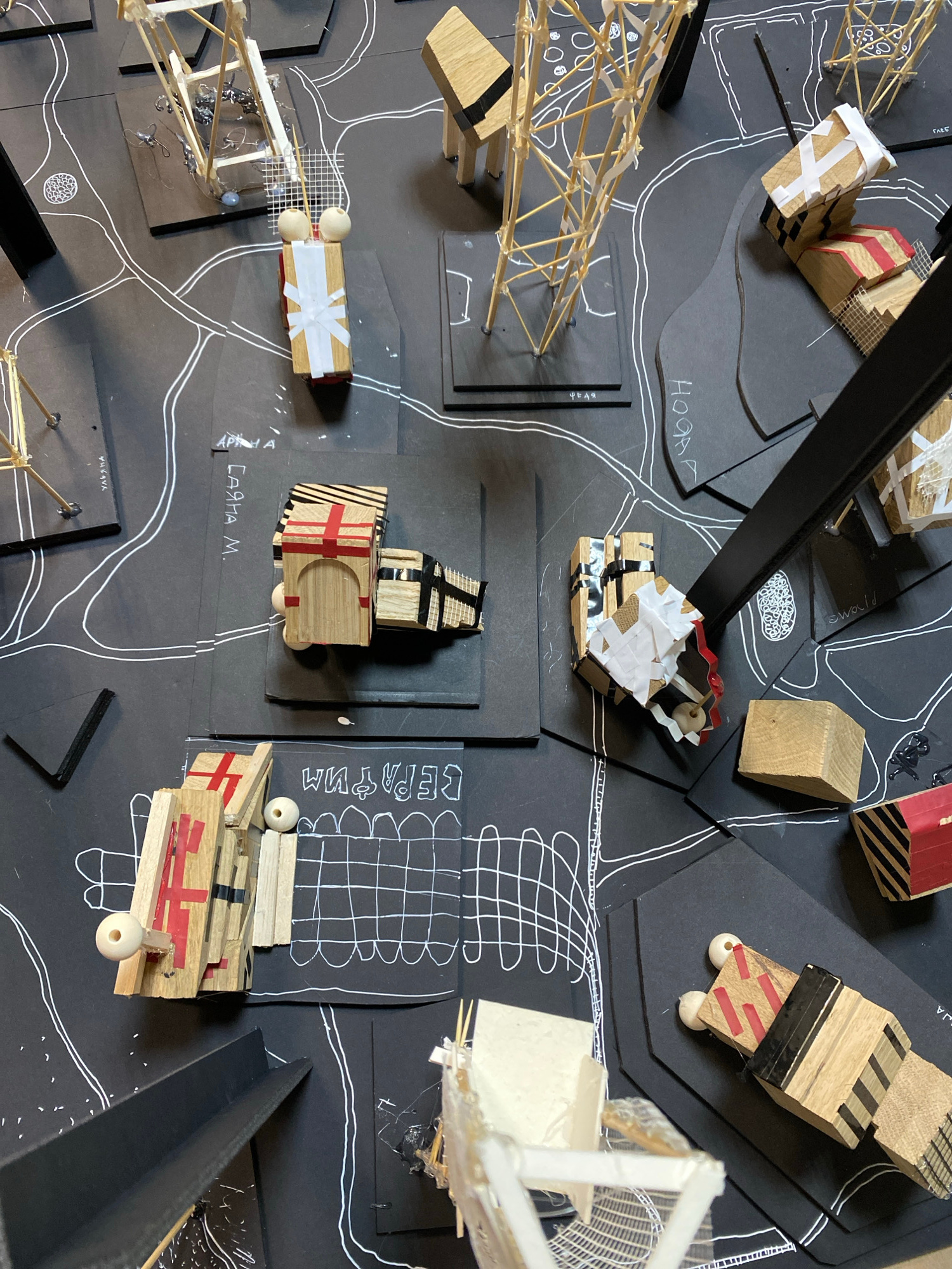 The image shows an architectural model of a possible urban plan for an area in Moscow, Russia. The model uses a black base on which a road network is sketched with white lines. Several small building…read more