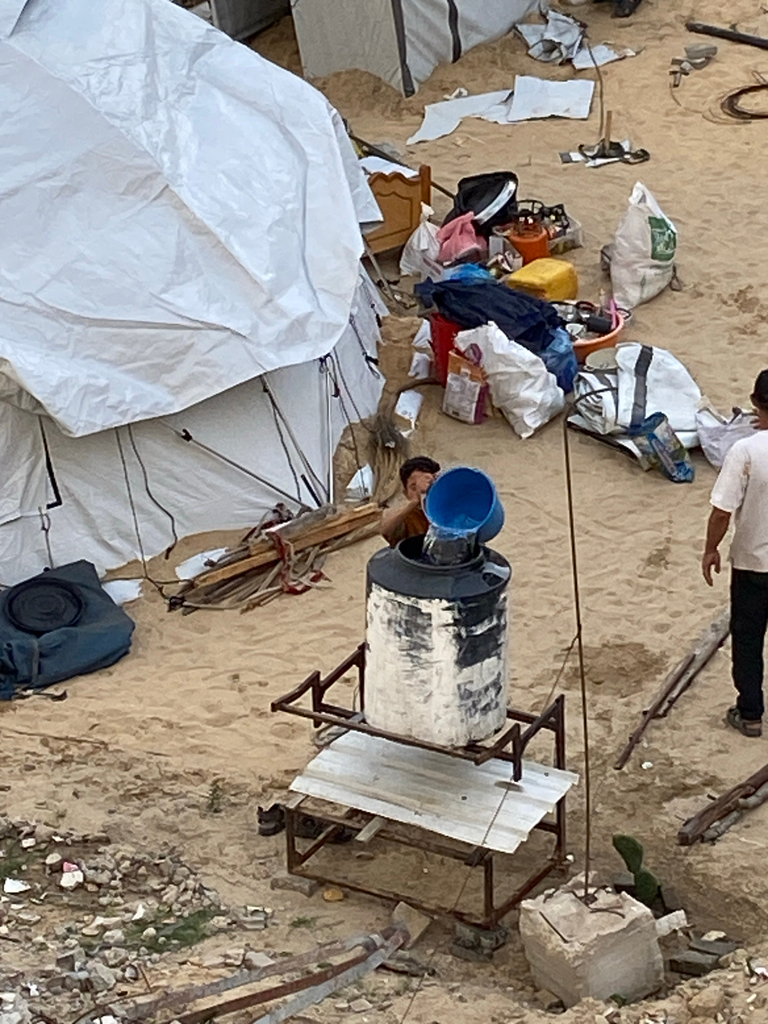 The image depicts an outdoor scene in Khan Yunis, Palestinian Territory. A person is pouring water from a blue bucket into a large, cylindrical water tank mounted on a metal stand. Nearby are numerous white, tent-like structures and a scattering of bags, clothes, and miscellaneous items. The ground is sandy. In the upper part of the image, a person is standing. | Open Wire