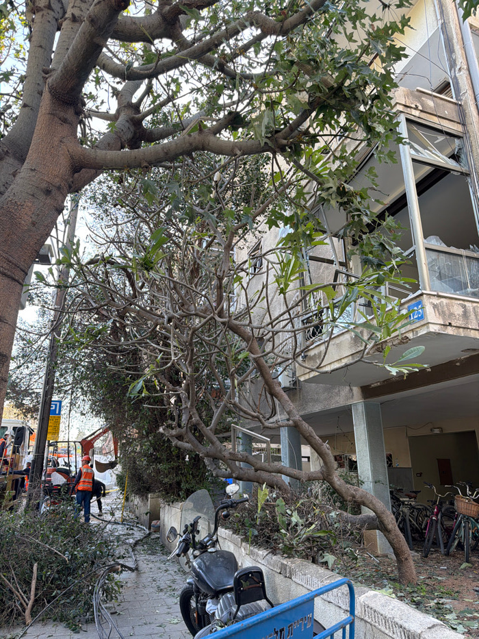 The scene depicts an urban street in Tel-Aviv, Israel, identifiable by a blue metal barrier marked "City of Tel Aviv-Yafo" in Hebrew. The environment is cluttered with extensive tree debris, includingβ¦read more