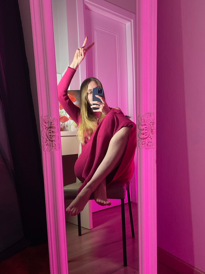 A female individual is depicted in a mirror selfie taken indoors. She is seated on a light-colored upholstered chair with dark legs, angled towards a large, rectangular mirror featuring an ornate whit…read more