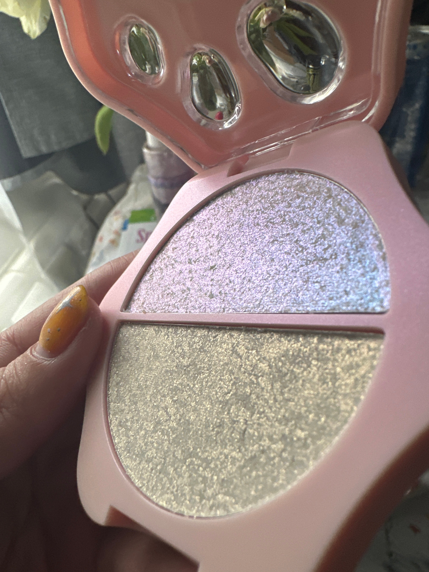 A close-up shows a pink, heart-shaped makeup compact held in a person's hand with yellow and silver-painted nails. The compact contains two shades of what appears to be iridescent highlighter: the lef…read more
