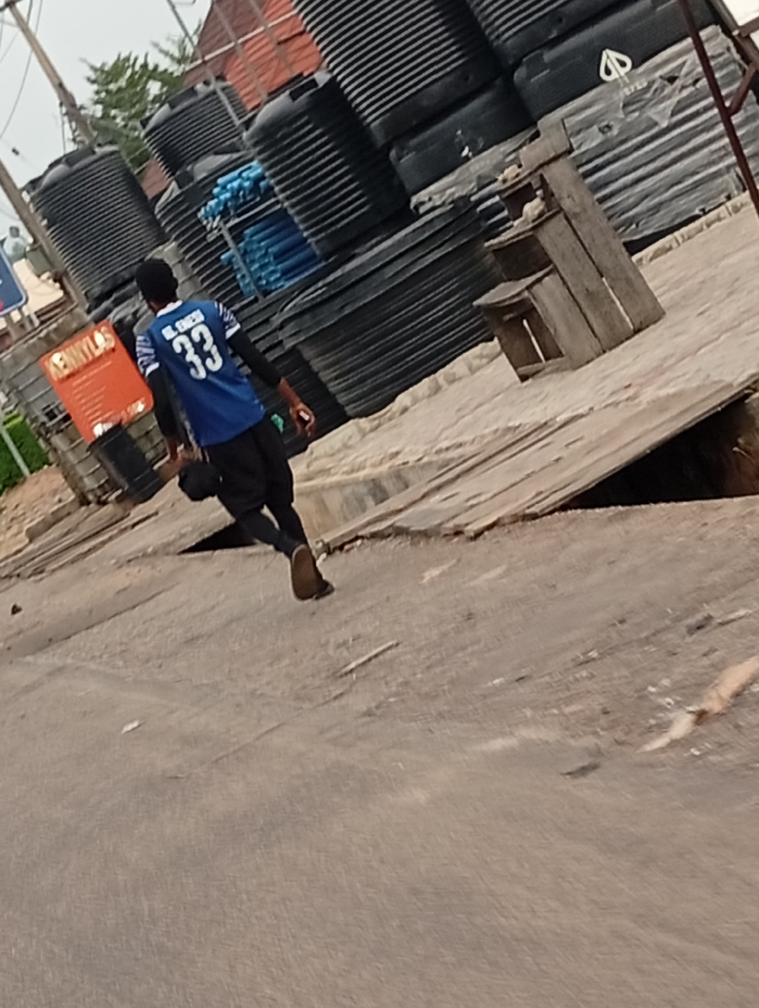 A person wearing a blue jersey with the number 33 is walking on a street in Adankolo, Nigeria. The person is walking on the left side of the street. A stack of large black plastic tanks sits to the pe…read more