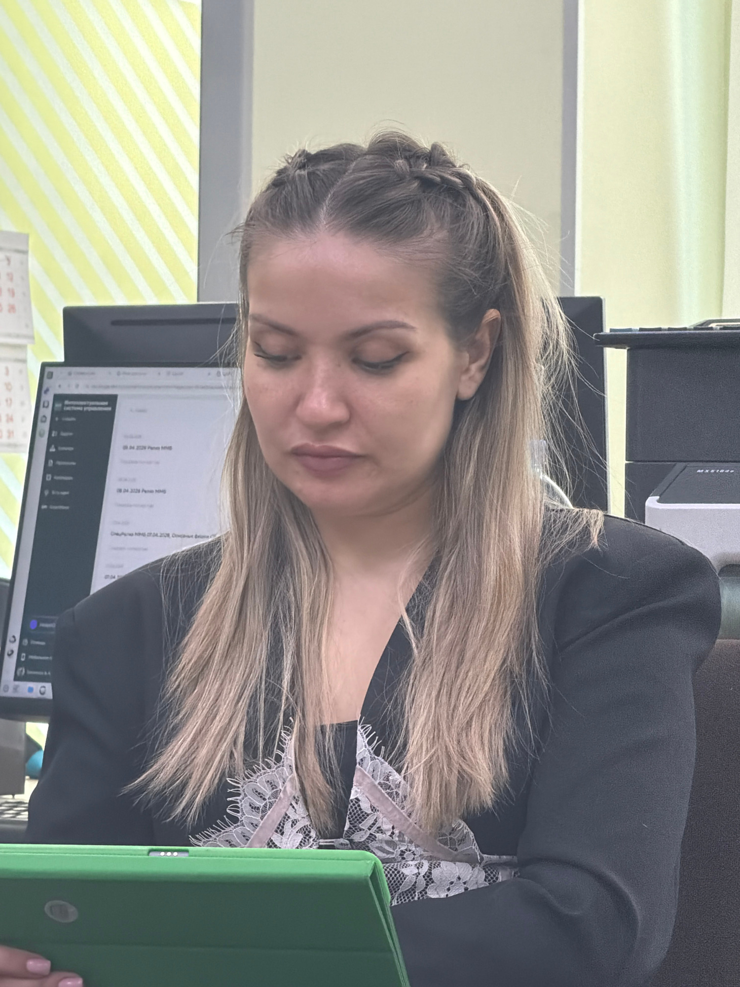 A woman with braided hair, wearing a black blazer over a white lace-trimmed top, is seated at a desk. A green tablet is held in her right hand. A computer monitor is visible in front of her, displayin…read more