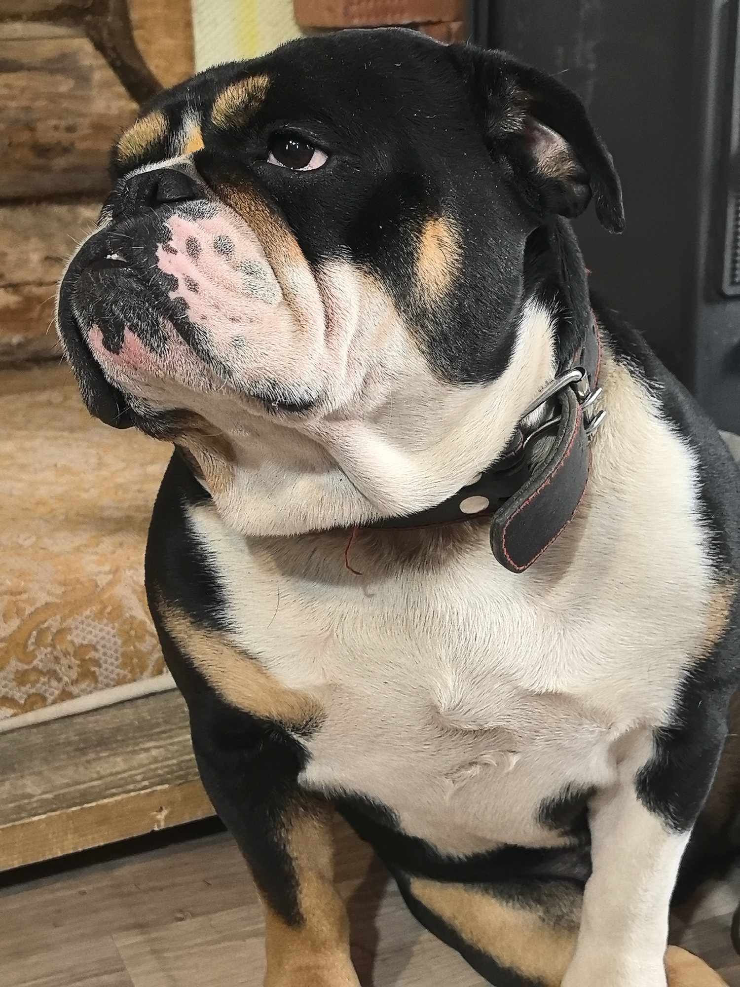 A bulldog with a black head, white chest and brown markings is sitting indoors. It is wearing a black leather collar with a metal buckle. The background shows a log wall and a patterned rug. The dog a…read more