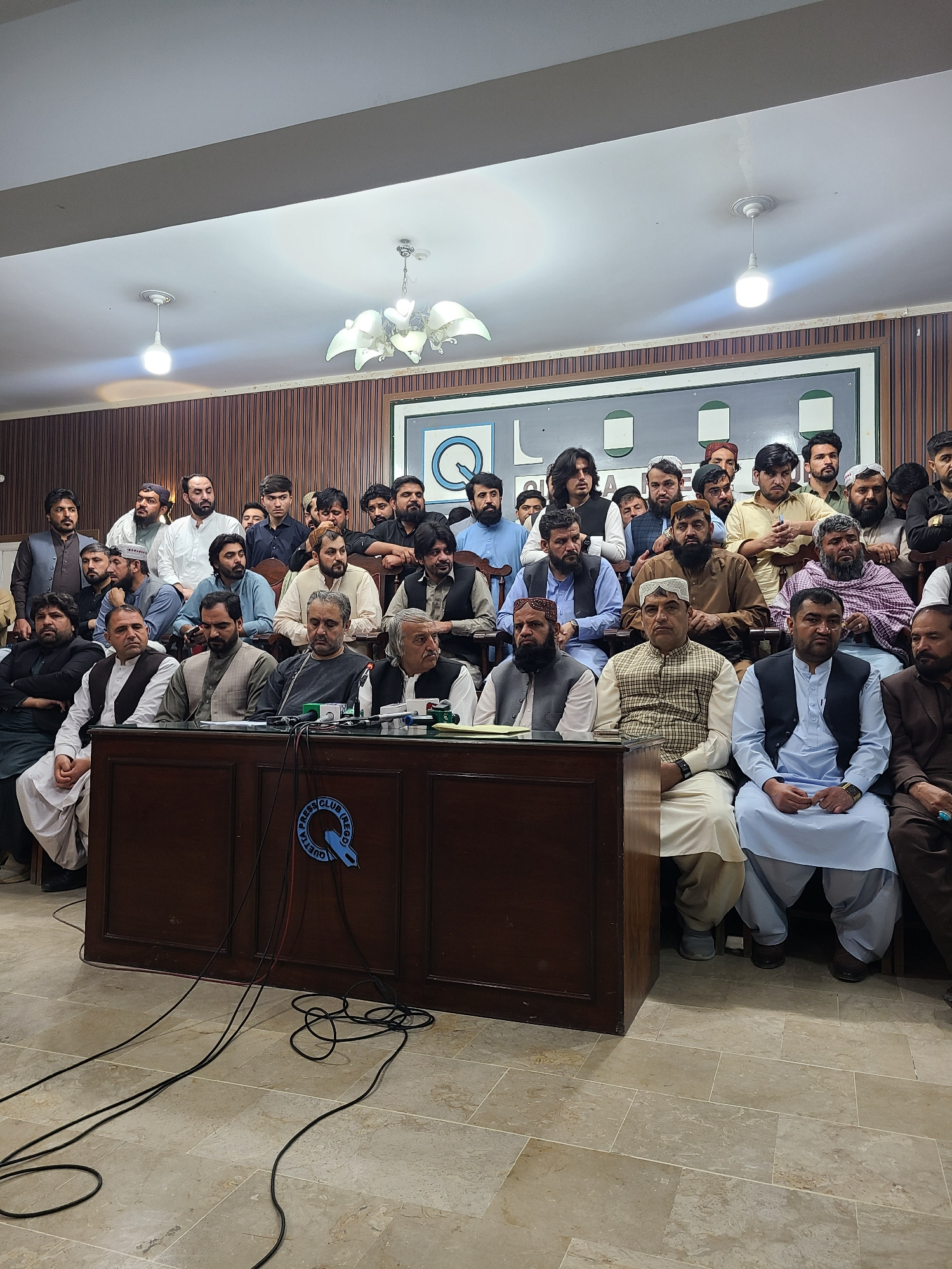 A crowded press conference at the Quetta Press Club in Quetta City Tehsil, Pakistan, features a group of men, primarily wearing traditional attire, seated and standing behind a wooden podium adorned w…read more