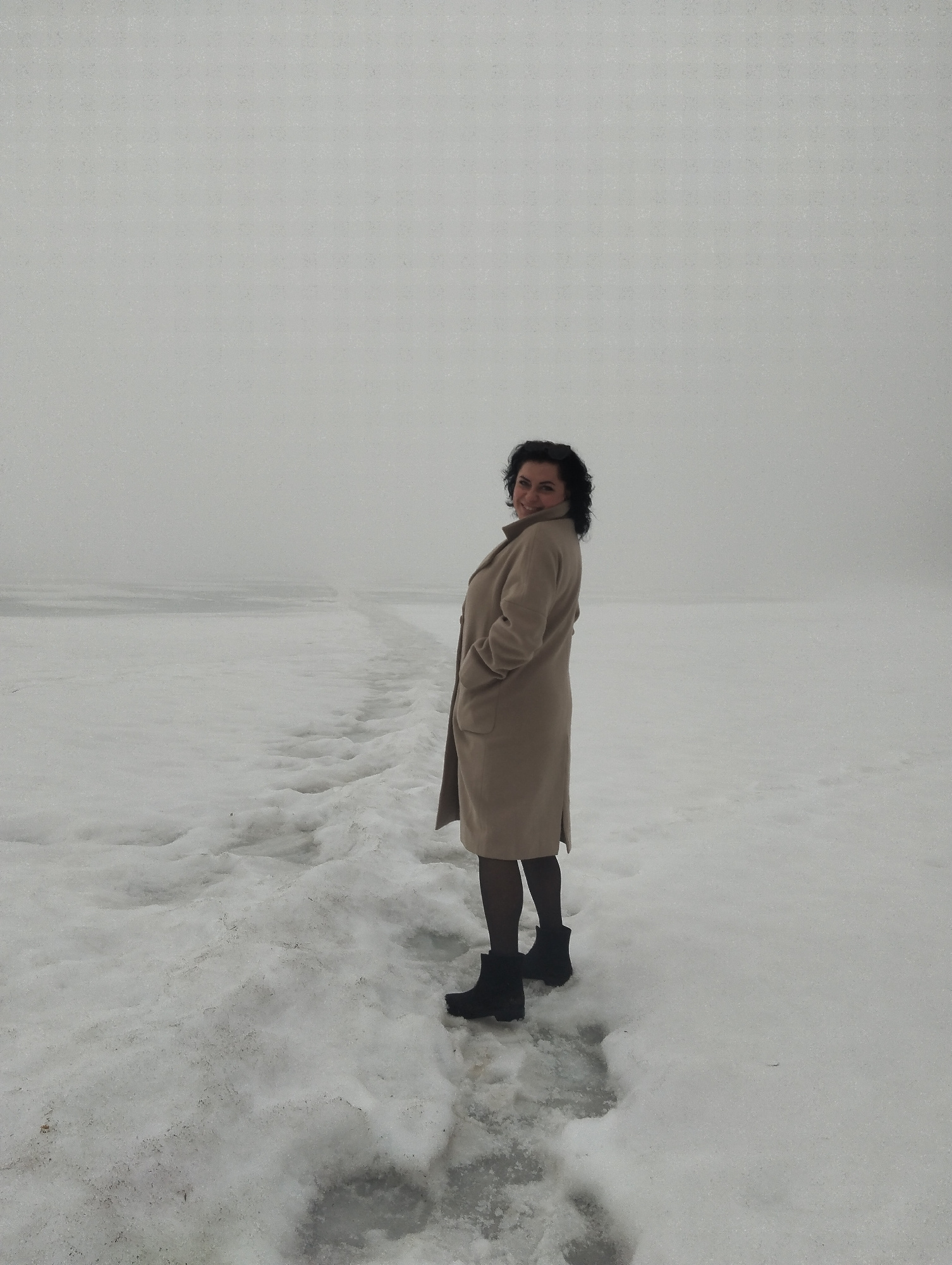 A woman is standing on a snow-covered surface. She is facing away from the camera, but looking back over her shoulder and smiling. She is wearing a long, light-brown coat, black tights, and black boot…read more
