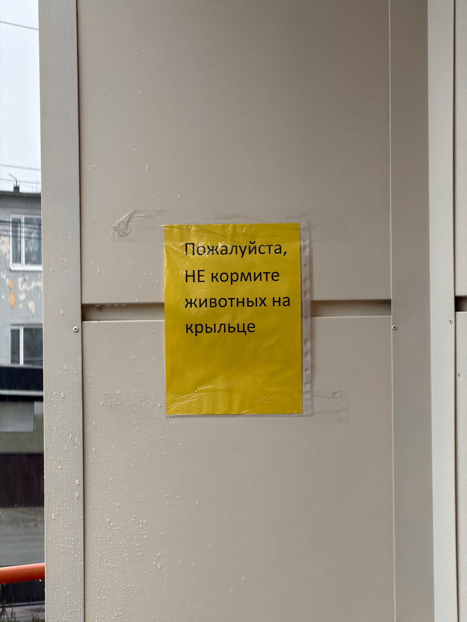 A yellow sign is taped to a light-colored, horizontally-oriented surface, likely a wall or panel. The sign contains text in Russian, with vertical text reading: "Пожалуйста, НЕ кормите животных на кры…read more