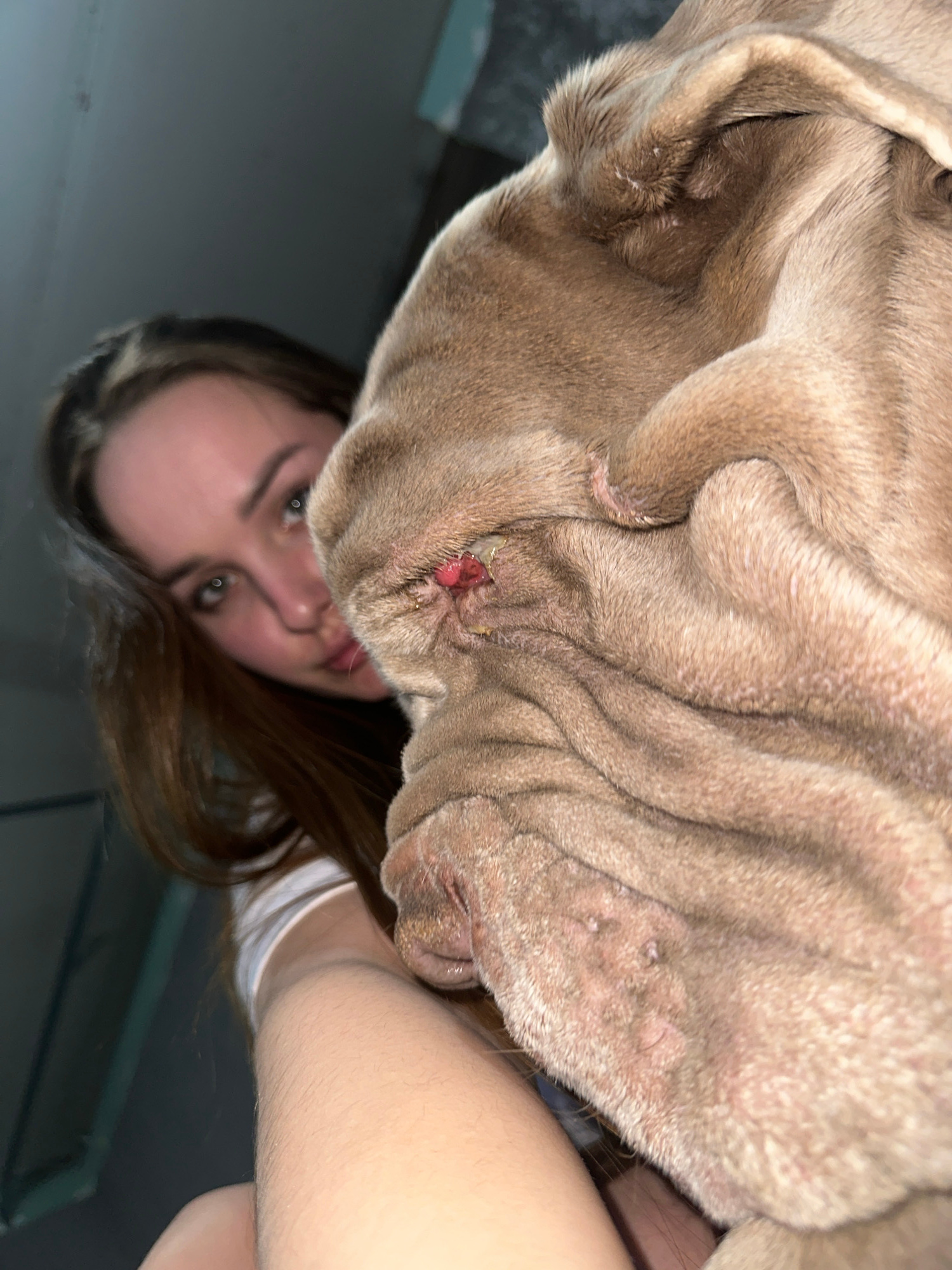 A close-up, low-angle photograph captures a light brown, heavily wrinkled dog and a young woman, both inverted from the viewer's perspective. The dog, likely a Shar-Pei breed due to its distinctive sk…read more
