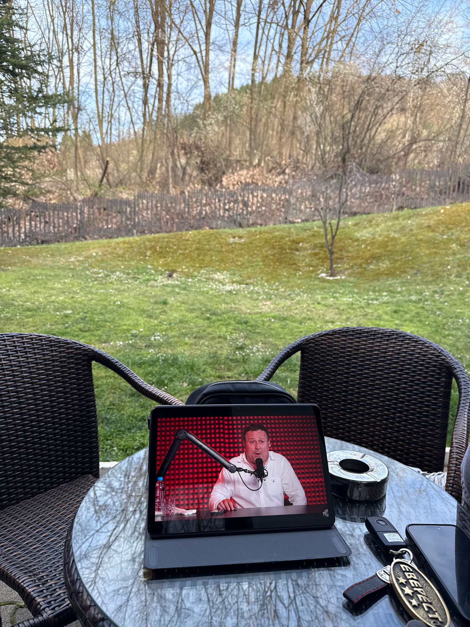 The image presents a scene outdoors, likely in a garden or patio area, with a blurred background of trees and grass. The foreground features a round glass-topped table with two woven wicker chairs parβ¦read more