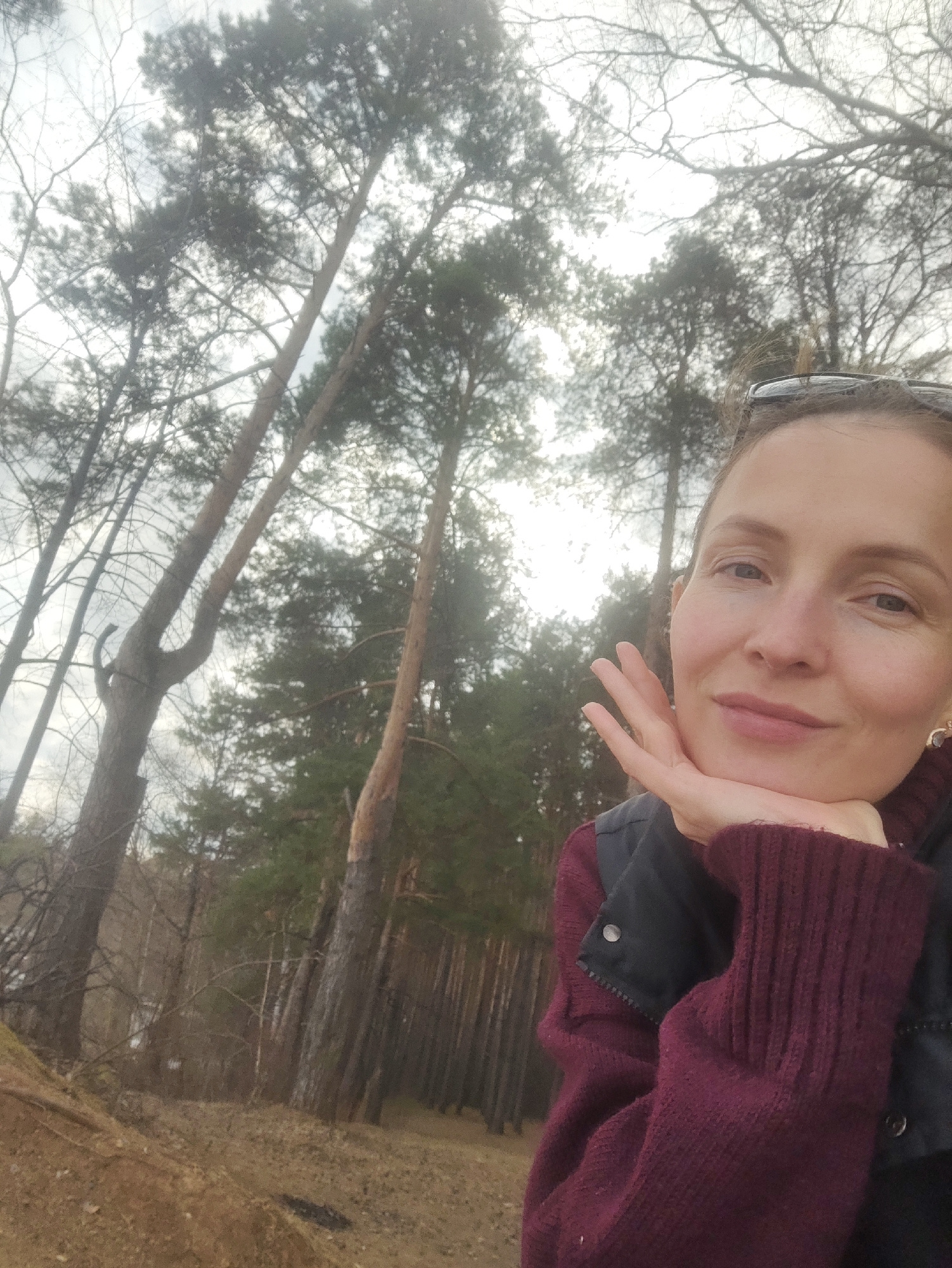 A woman is captured in a close-up selfie, set against the backdrop of a forest in Chaikovsky, Russia. She is looking directly at the camera with a calm, gentle smile, her chin resting lightly on her l…read more
