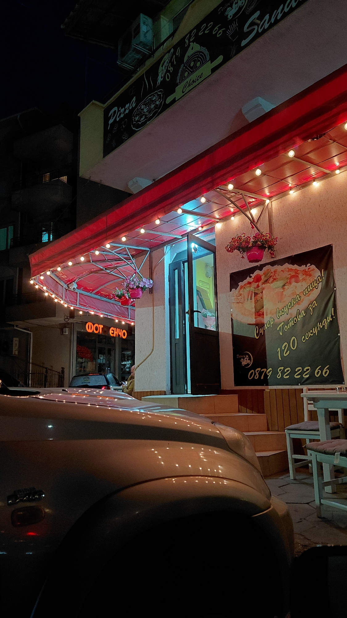 Here is a description of the image: The image shows a nighttime scene of a storefront in an urban setting. The word "Pizza" is visible on a sign on the left side of the frame, along with a phone numb…read more