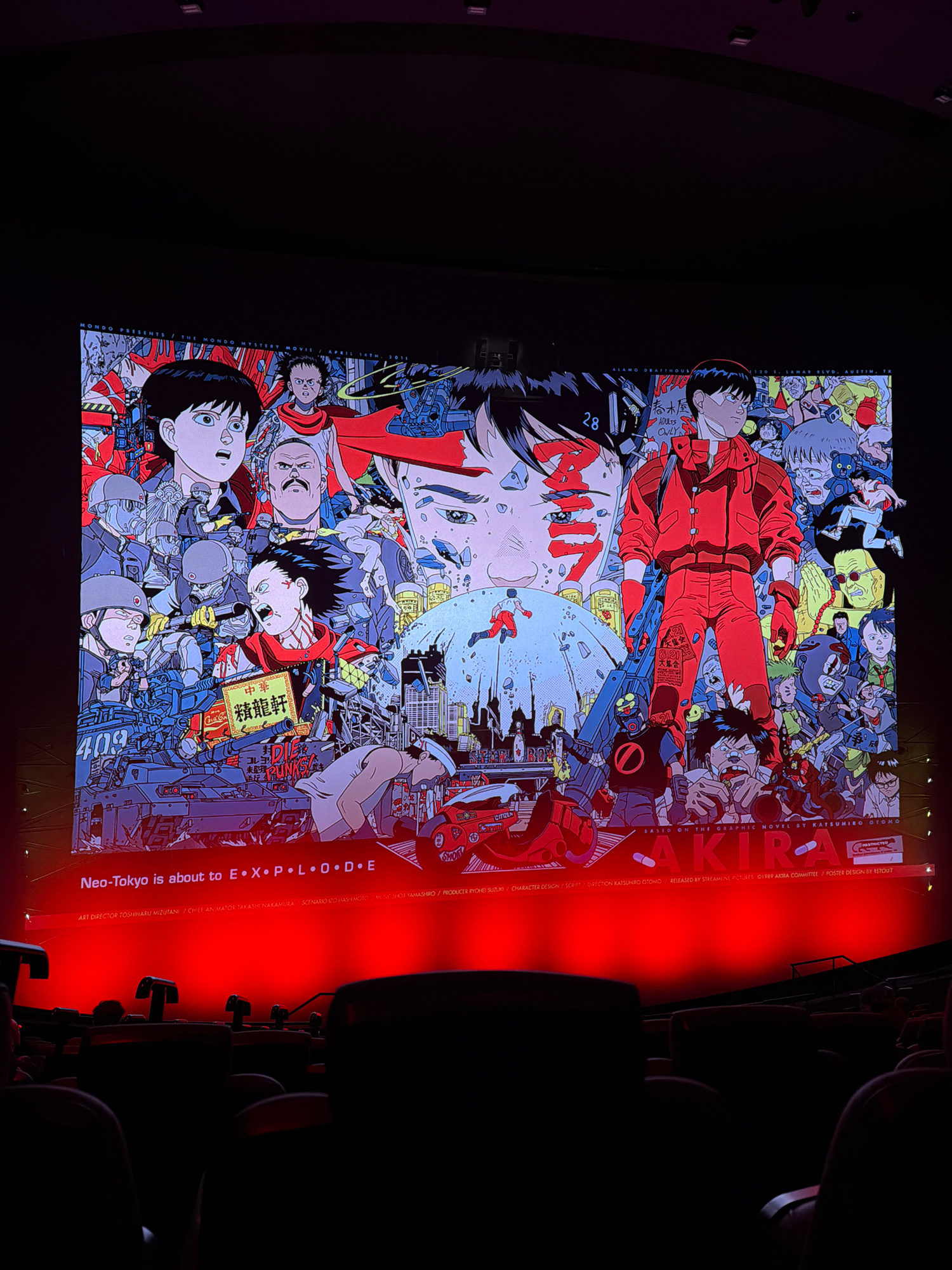 A photo taken inside a dark movie theater shows a screen displaying a poster for the animated movie "Akira." The poster features a collage of characters and scenes from the film in a chaotic compositi…read more