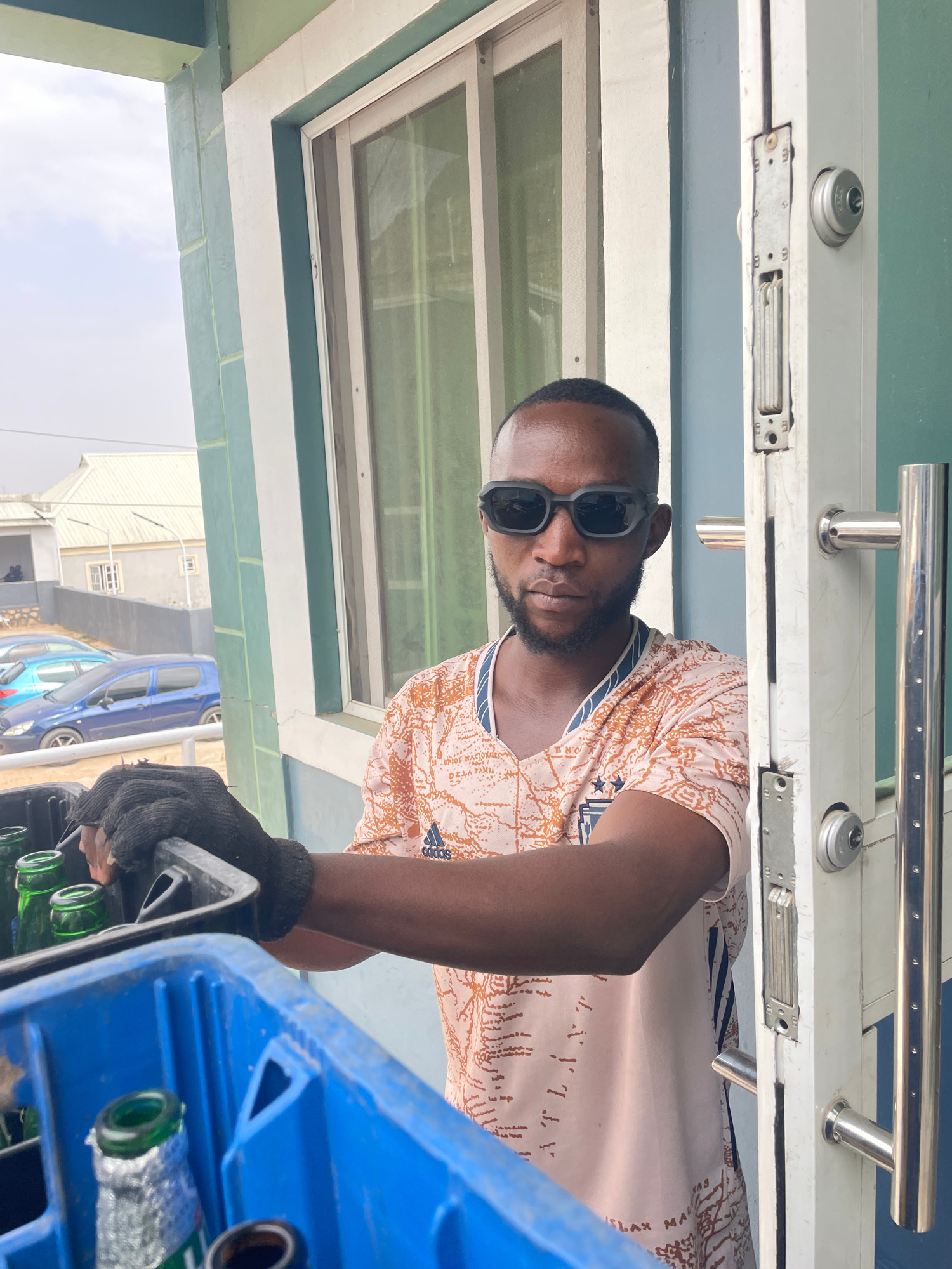 A man with dark skin and a beard wearing sunglasses and a patterned t-shirt is holding a blue plastic crate filled with green glass bottles. He is wearing a grey glove on one hand. He is standing unde…read more