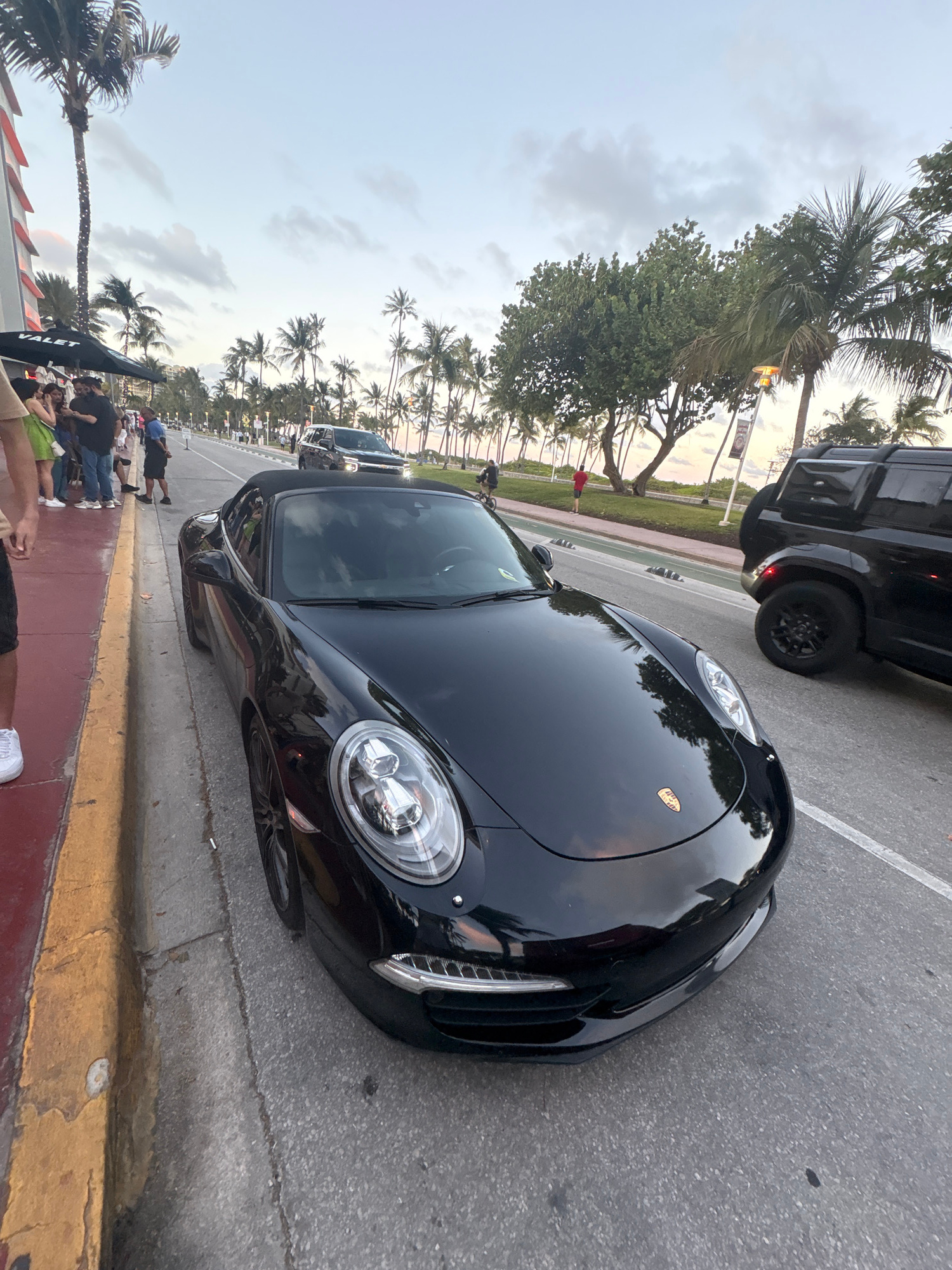 The image captures a street scene in Miami Beach, United States of America, likely during late afternoon or early evening due to the overcast sky. A sleek black Porsche convertible is prominently feat…read more
