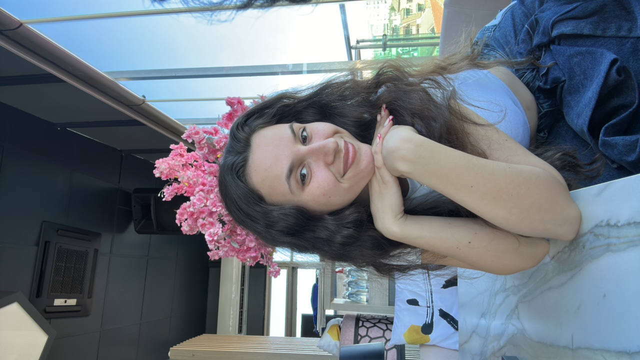 A black and white husky dog is lying on a pink bed, looking up at the camera. Behind the dog, there is a bouquet of flowers and two rectangular objects on a gray wall. The specific location in the cit…read more