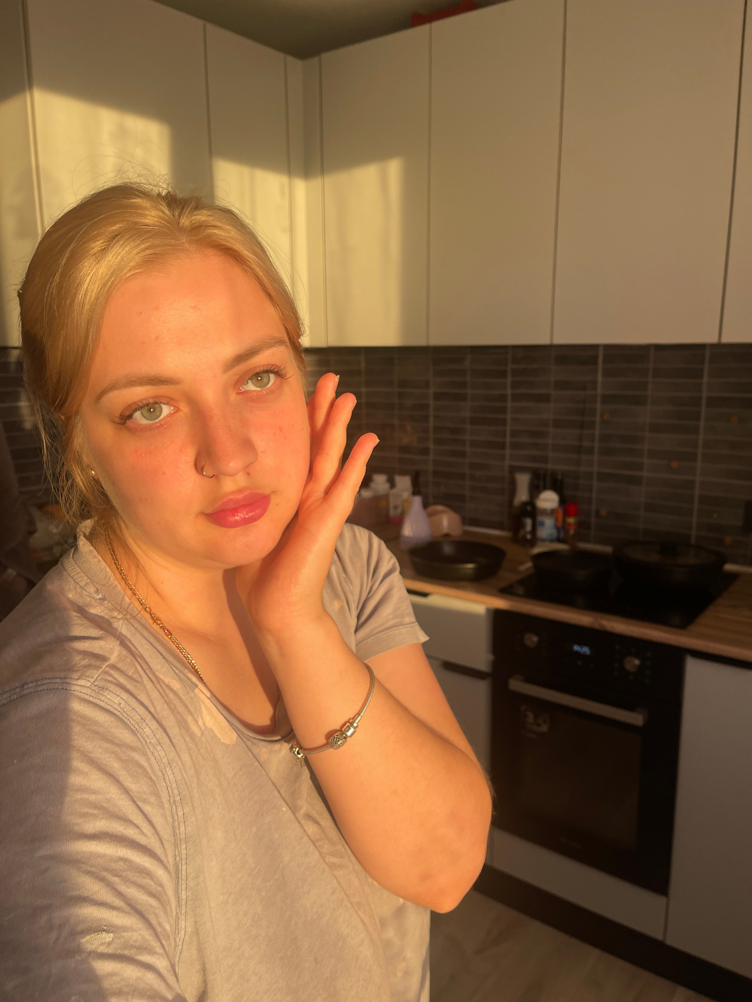 A selfie photograph captures a young woman with blonde hair and green eyes, positioned indoors in a home kitchen. The image is taken at a 90-degree counter-clockwise rotation, showing the woman's head…read more