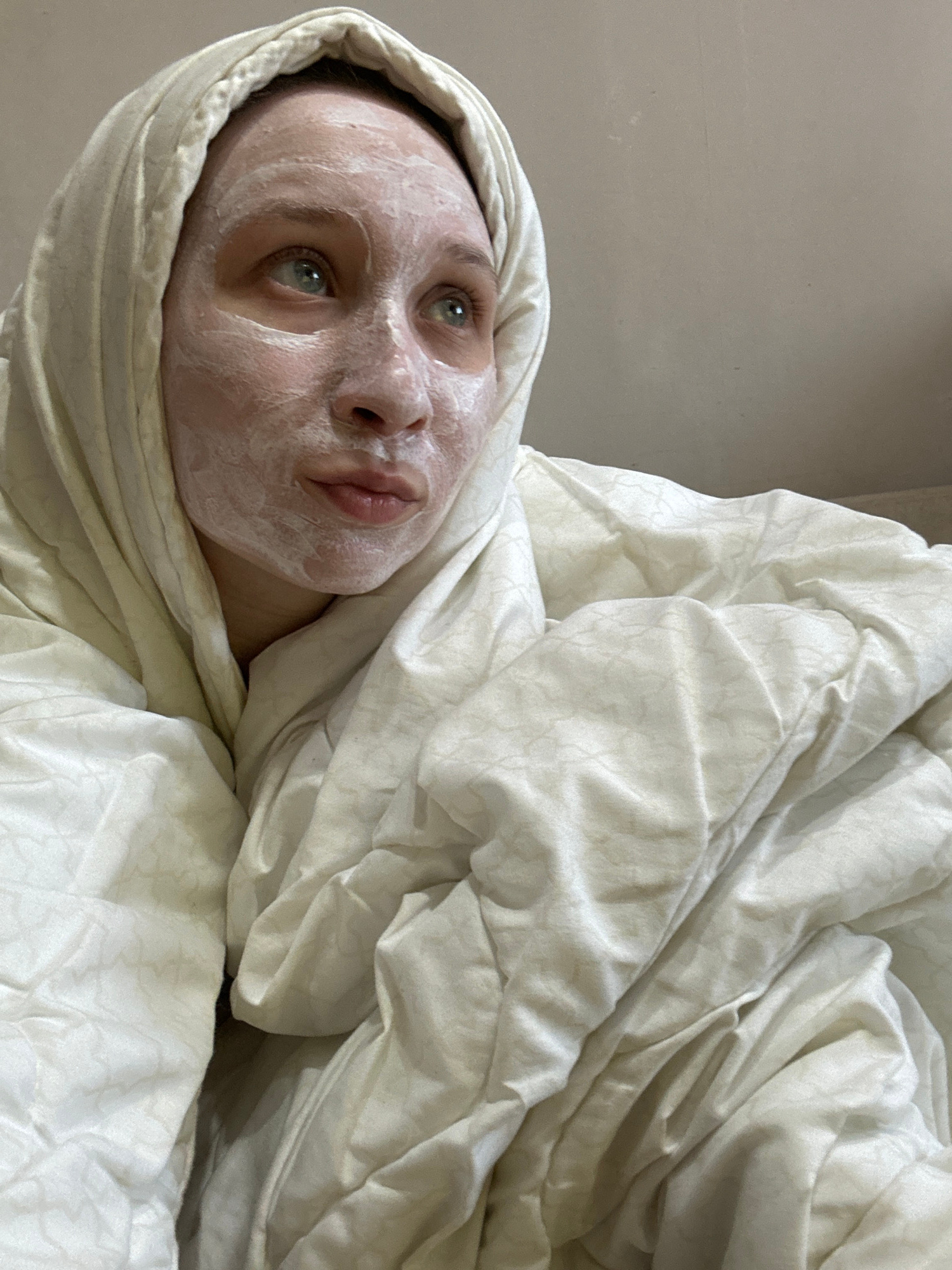 The image, taken in Chaikovsky, Russia, shows a young woman lying down and wrapped comfortably in a voluminous, light-colored comforter. Her face is covered with a thick layer of a white facial mask,…read more
