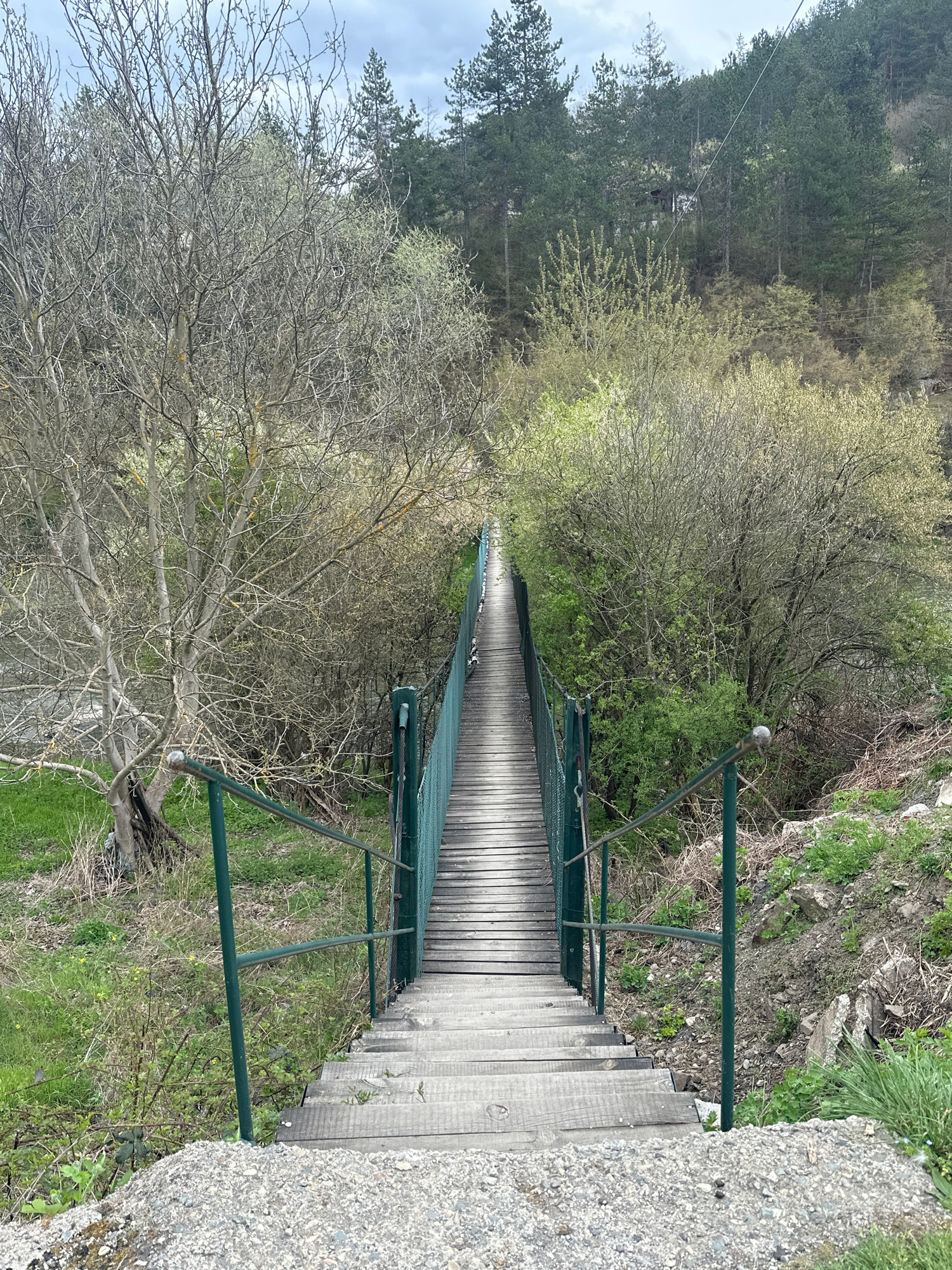 The image shows a long, wooden pedestrian suspension bridge in Tompsan, Bulgaria. The bridge has green metal railings and extends into a wooded area. The bridge deck is made of parallel wooden planks.…read more