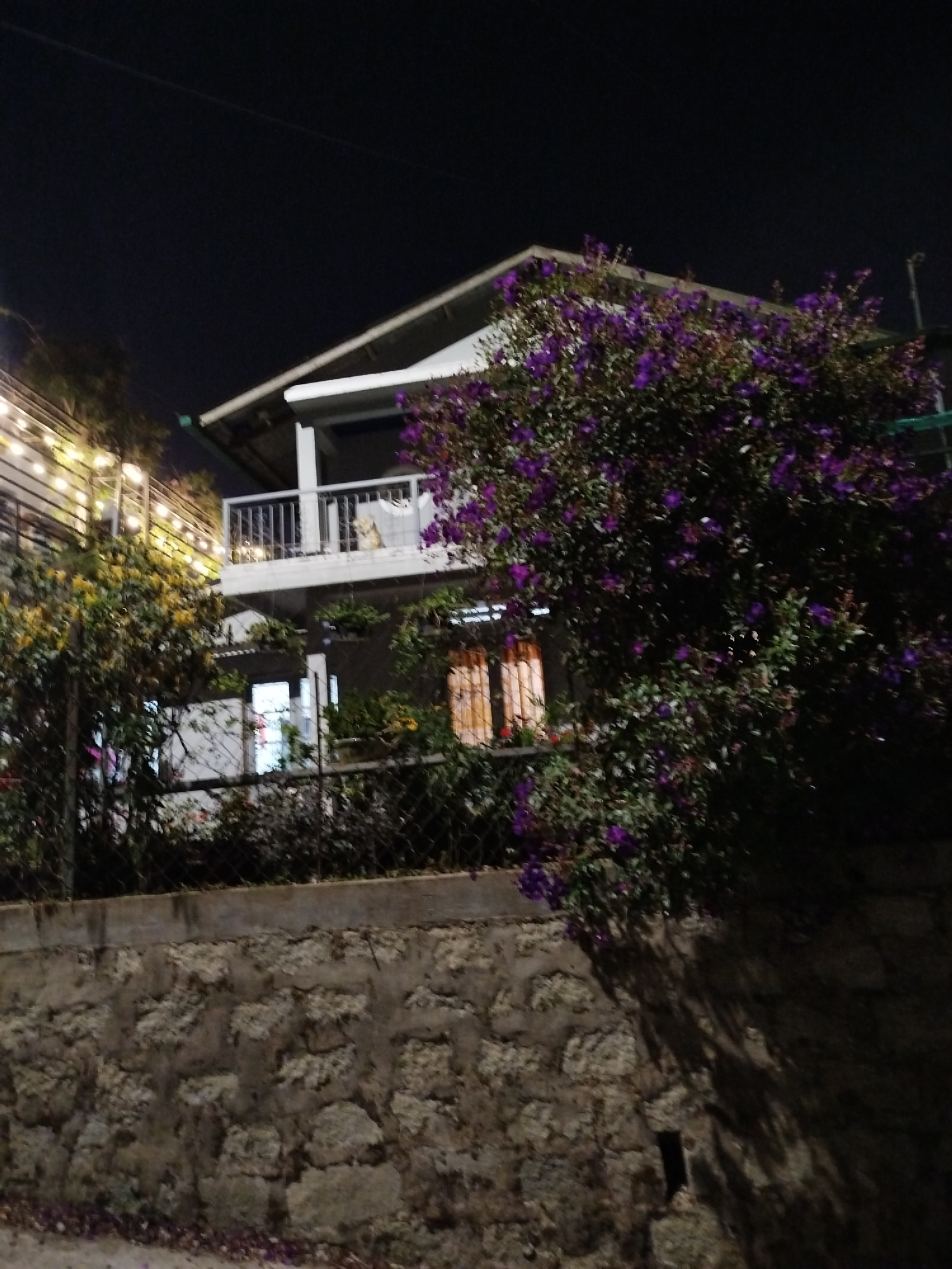 A two-story building with a balcony is partially visible behind a stone wall and vegetation at night. The building is white with a dark-colored roof. A wrought-iron balcony with a railing is on the se…read more