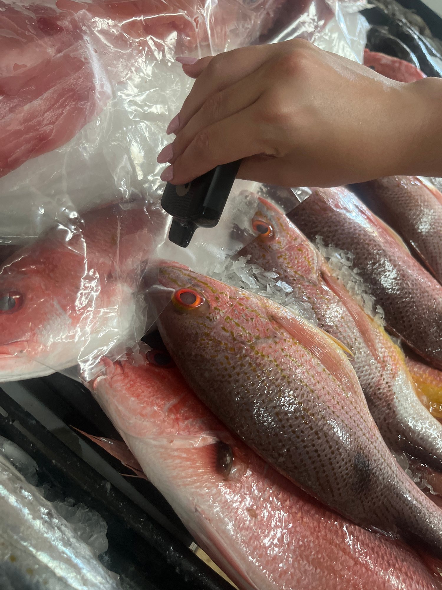 In a market setting, likely in Puerto Escondido, Mexico, a person with manicured nails holds a small black object (possibly a pen or marker) over a display of red snapper fish. The fish are arranged o…read more