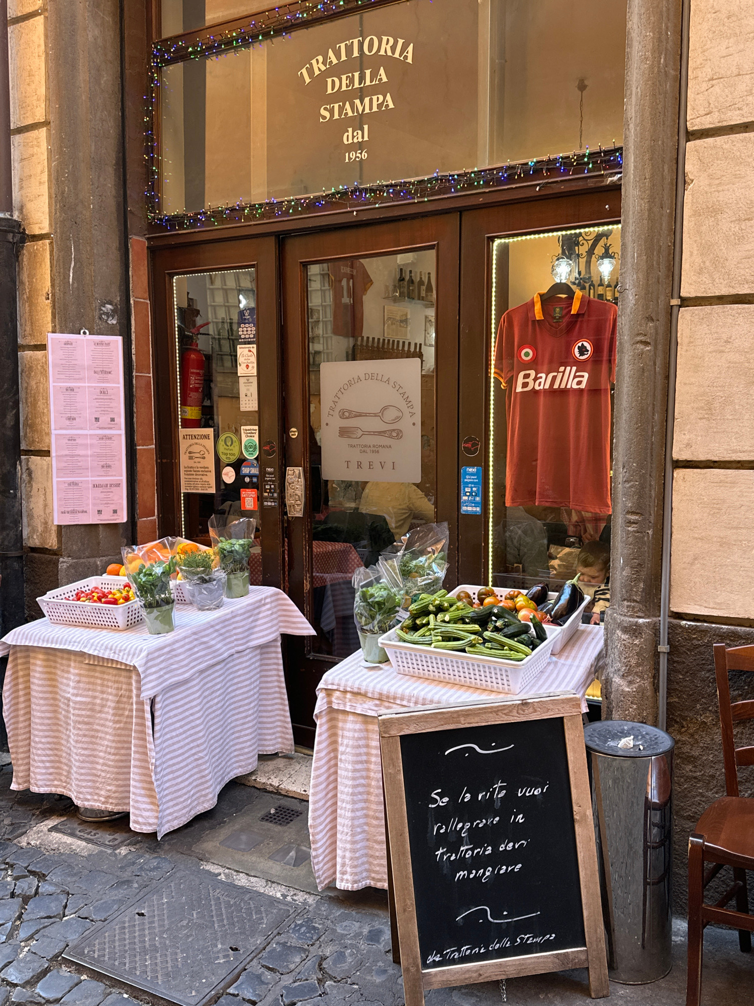 The image depicts the exterior of "TRATTORIA DELLA STAMPA dal 1956," located in the Trevi district of Rome, Italy, as indicated by signage. The trattoria's entrance consists of dark wooden double door…read more