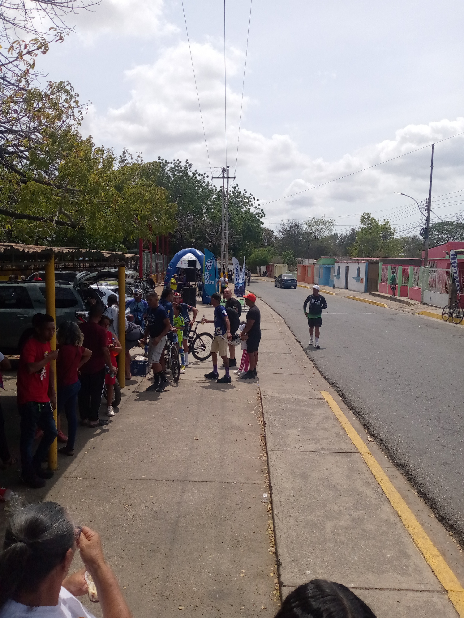 The image shows a street scene in Las Barrancas, Venezuela. A group of people are gathered on a sidewalk next to a building with a canopy. Some are wearing red shirts. A number of bicycles are present…read more