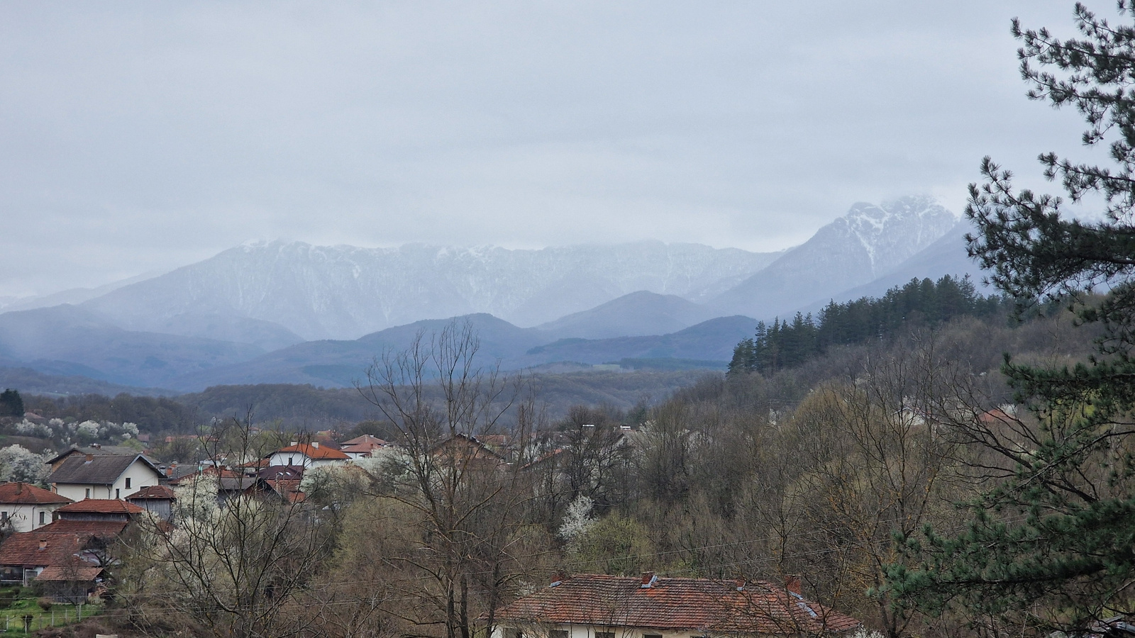 The image depicts a view of the city of Apriltsi, Bulgaria, under an overcast sky. In the foreground, residential houses with terracotta roofs are interspersed with trees, some bare and some in early…read more