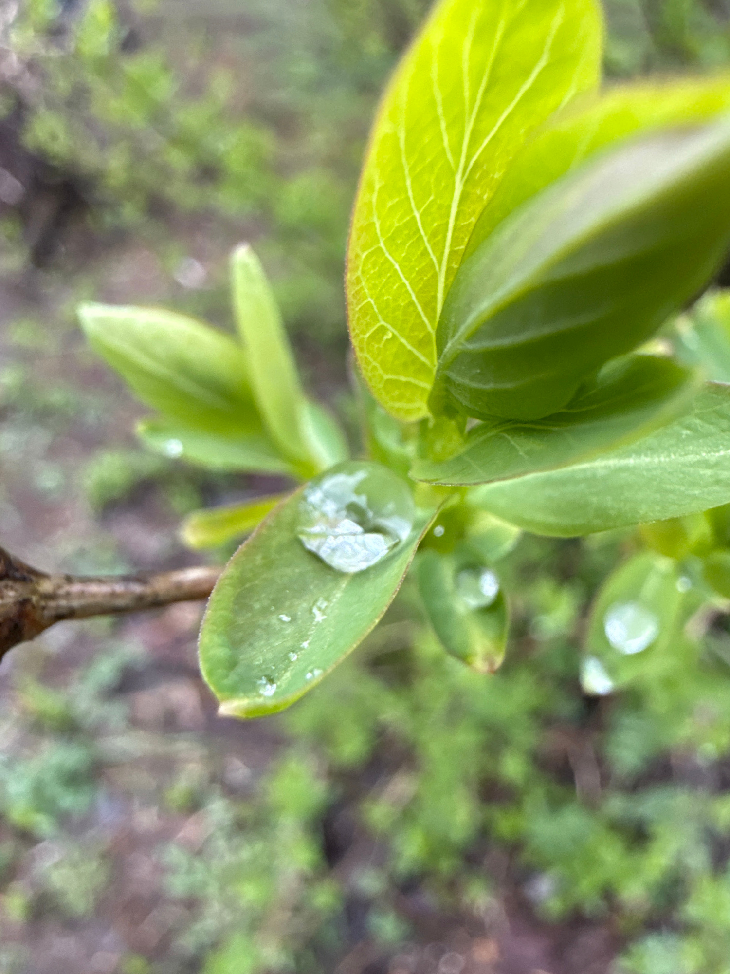 The image depicts a close-up shot of green leaves with water droplets on them. The leaves appear to be young and vibrant, with detailed vein patterns visible. One prominent droplet is positioned on a…read more
