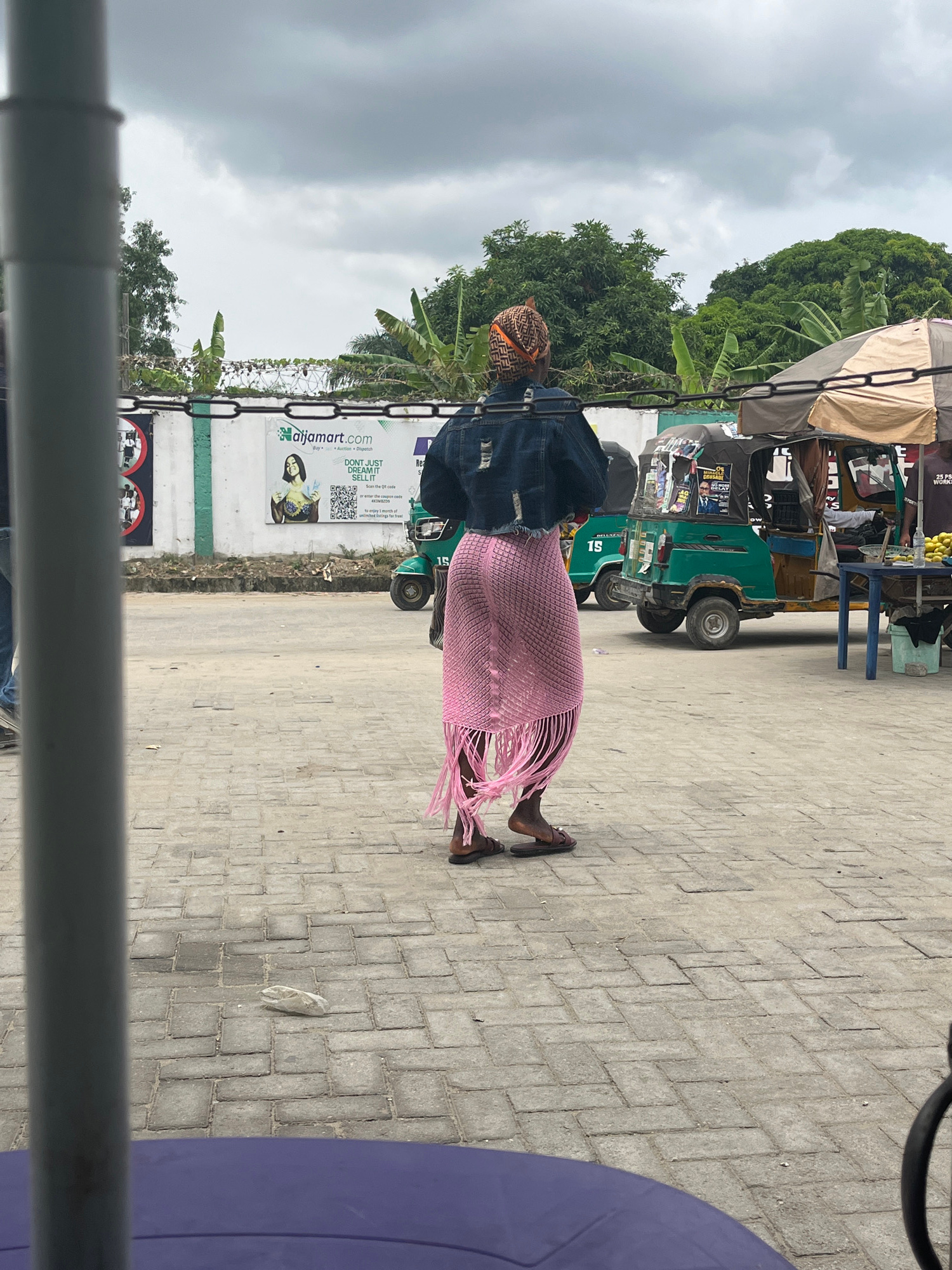 The scene is set in Lekki, Nigeria. The image focuses on an elderly woman, her back to the camera, wearing a denim jacket and a pink fringed skirt. She is walking along a paved pathway. To her left, t…read more