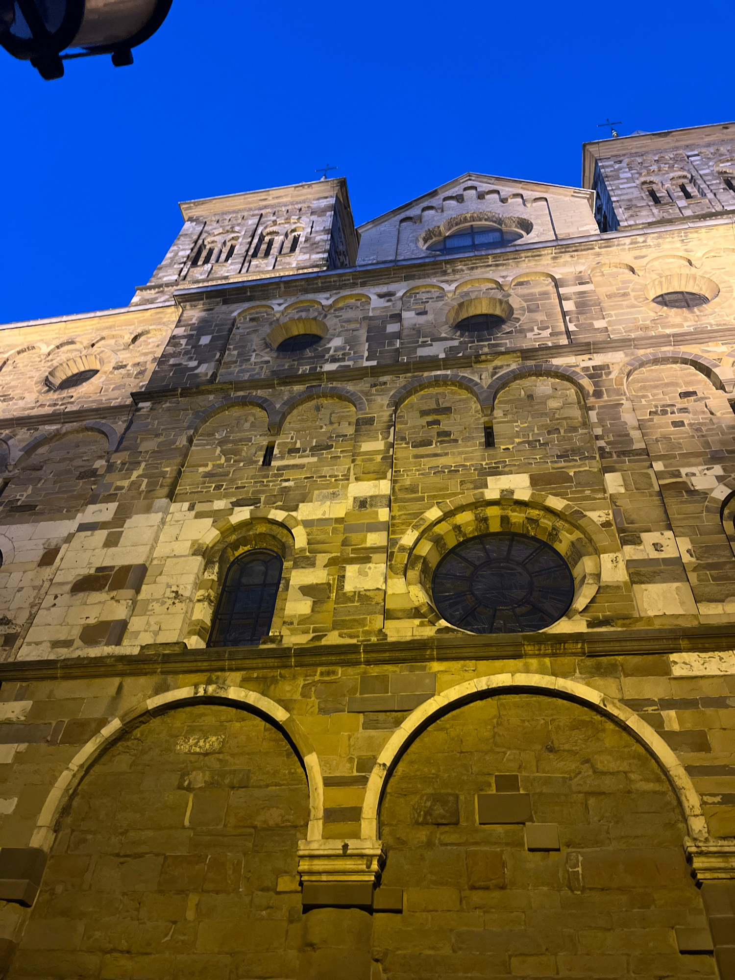 The image shows the Basilica of Saint Servatius in Maastricht, Netherlands, from a low angle at night. The Basilica is constructed of stone and has round windows and large circular arches. The night s…read more