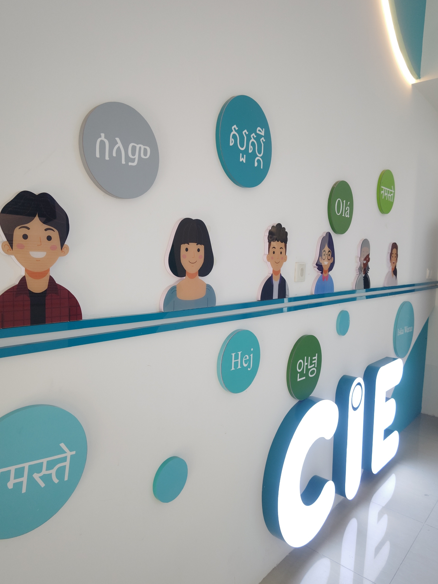 The image depicts a wall decoration in a building in the Chongqing High-tech Zone, China. The decoration features the word "LIFE" in large, illuminated white letters against a blue background. Along t…read more