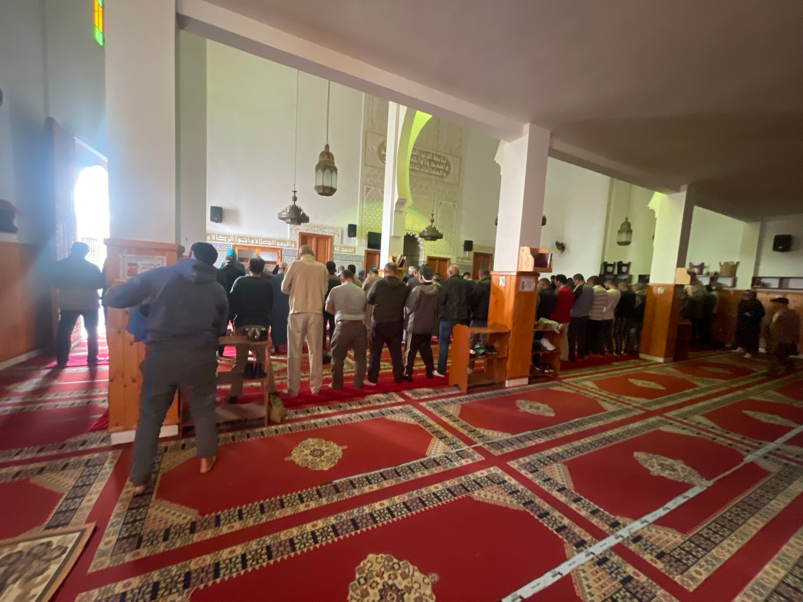Inside a mosque, a group of men stand in rows facing forward, engaged in prayer. The mosque has white walls, and large open spaces. Hanging lamps are suspended from the ceiling. A large red carpet covers the floor, patterned with geometric designs. Wooden shelves and racks line the walls. Text is displayed above the interior window in Arabic. This photo was likely taken in the city of Safi, Morocco. | Open Wire