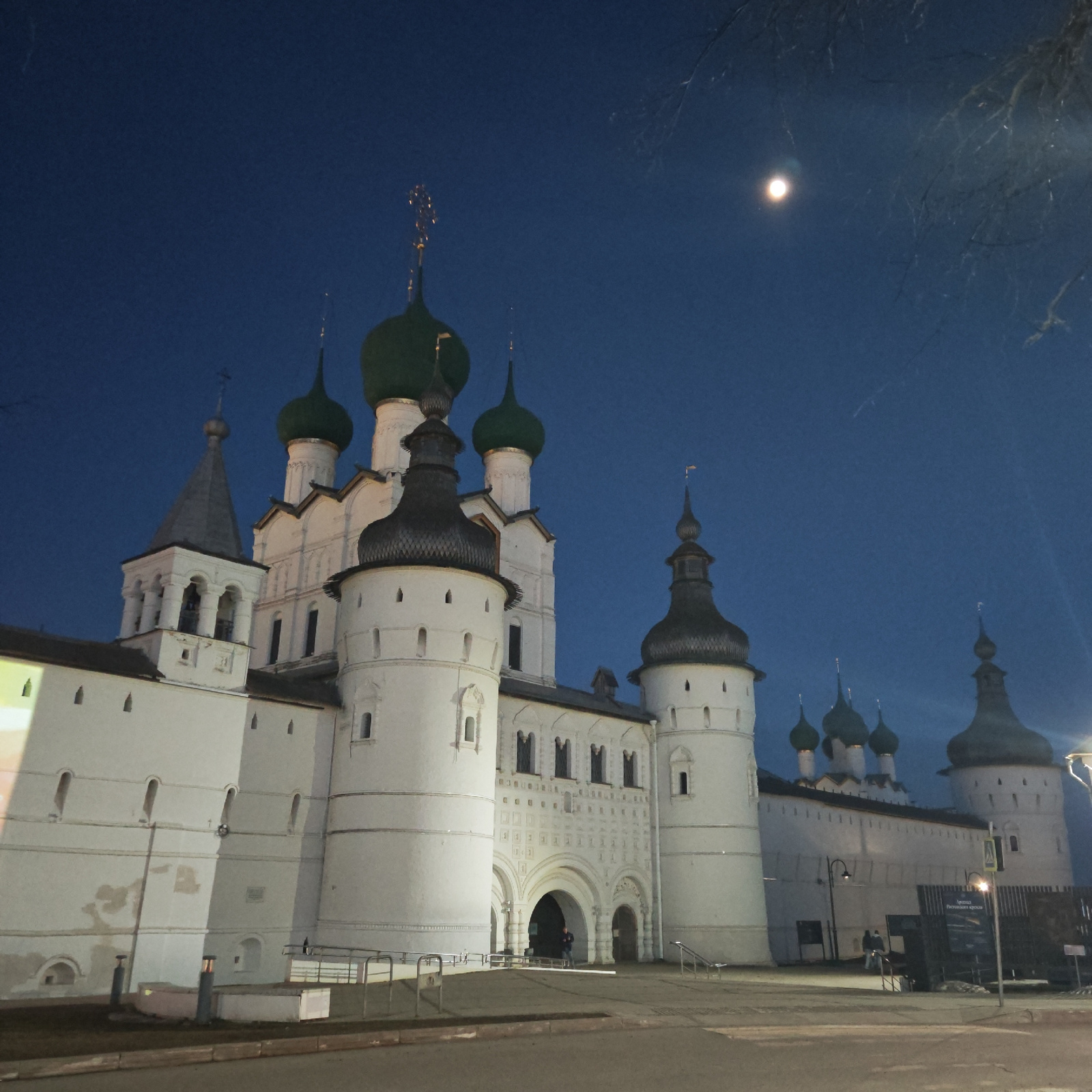 The image shows a view of the Rostov Kremlin in the city of Rostov, Russia at night. The Kremlin's white walls and towers are illuminated, standing out against the dark blue sky. Several green-domed c…read more