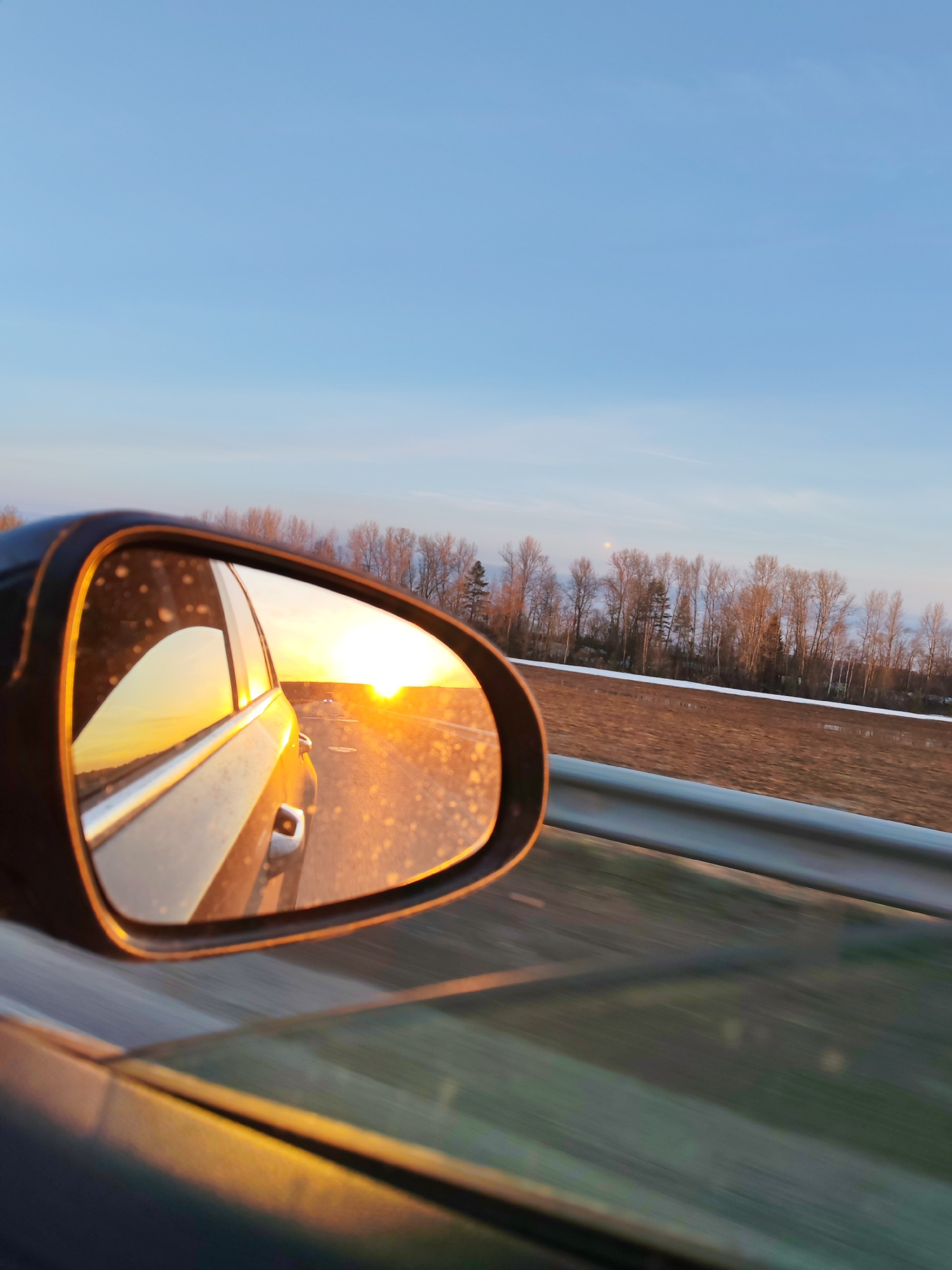The image shows the side view mirror of a moving car, reflecting the setting sun on a highway. The mirror also shows another car on the road and the surrounding landscape, including trees and fields.…read more