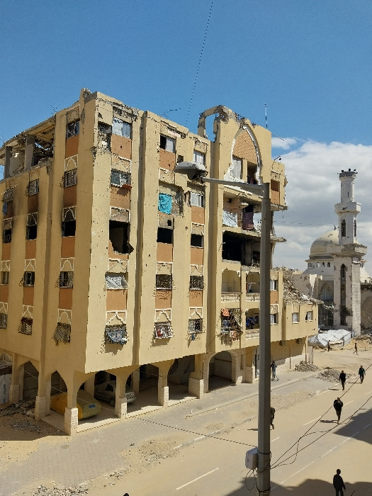 The image displays an urban street scene in Khan Yunis, Palestinian Territory, marked by extensive structural damage. A multi-story residential or commercial building, approximately six to seven floor…read more