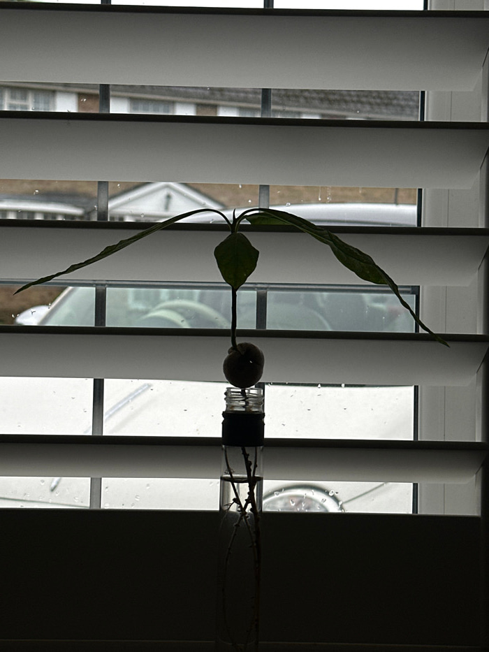 The image depicts an indoor scene looking out through a window in Wealden, United Kingdom. A sprouted avocado plant is the primary subject, centered in the foreground. It features a dark brown, oval-s…read more