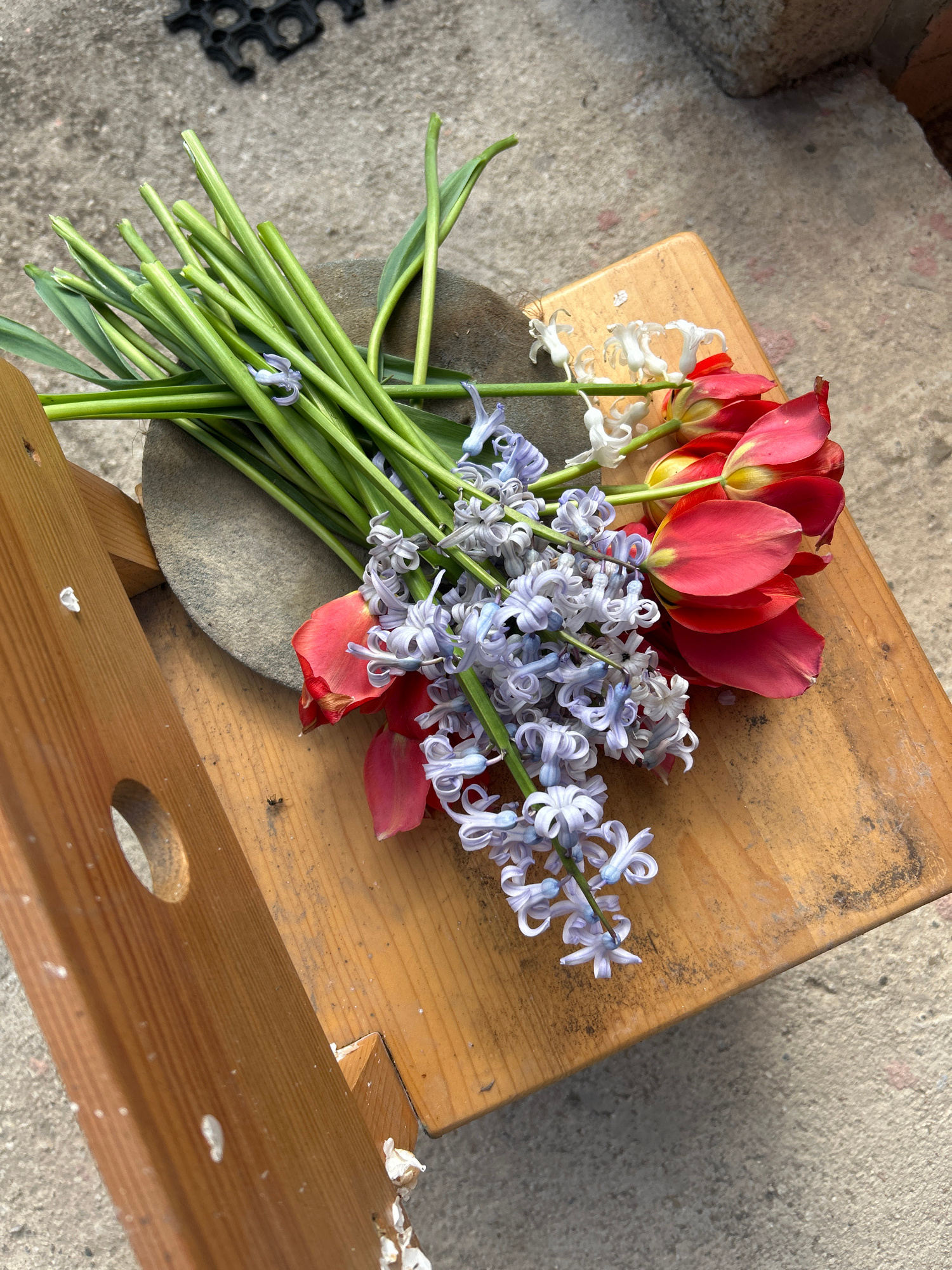 A small bouquet of flowers rests on a wooden stool. The bouquet contains red tulips, white flowers, and light blue hyacinths. The flowers' stems are bundled together and arranged on a gray stone. The…read more