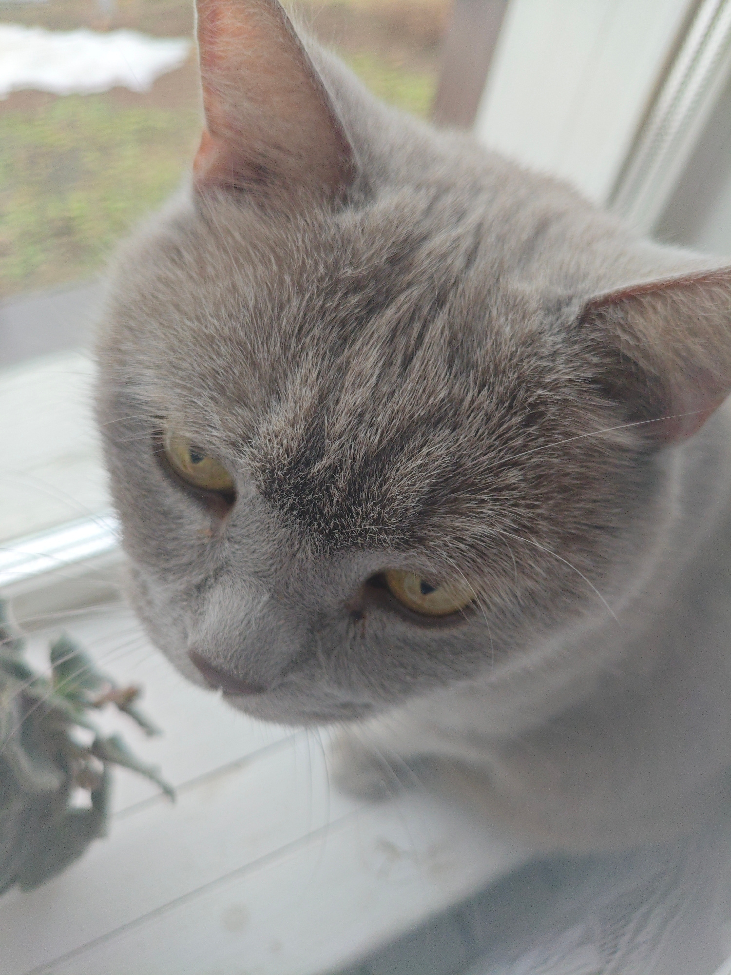 A gray cat is sitting on a windowsill next to a potted plant. The cat is looking down with yellow eyes. The background shows an out-of-focus view of trees and snow. The photograph was taken in Dubovay…read more